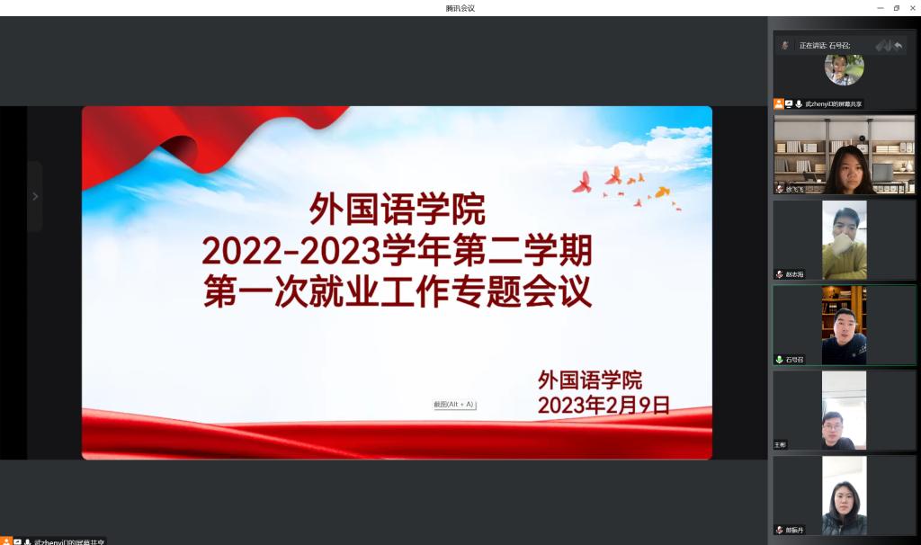 为了全力推进毕业生就业工作顺利开展,助力2023届毕业生能就业,就好业,2023年2月9日上午10点,全球十大网赌正规官网在学院通过腾讯视频会议平台召开了2022-2023学年第二学期第一次就业工作专题会议,会议由学院党委书记石皓召同志主持,2023届毕业班全体辅导员老师参加了会议。