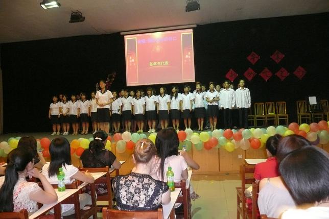 穿插在节目中间的有,伴有毕业生四年生活照和各种校园风景照幻灯播放,在校生代表的送别诗朗诵、毕业生代表金文的谢辞、以及系主任张宝红老师、日语教研室主任陈贺丽老师的致辞等,这些环节把晚会一次又一次推向高潮。尤其是全体毕业生的谢师礼,当全体毕业生向以张宝红为代表的老师们鞠躬致谢时,她们含泪紧紧拥抱的情景,令在场的师生感动得忍不住落下了眼泪,给大家留下了很深的印象。