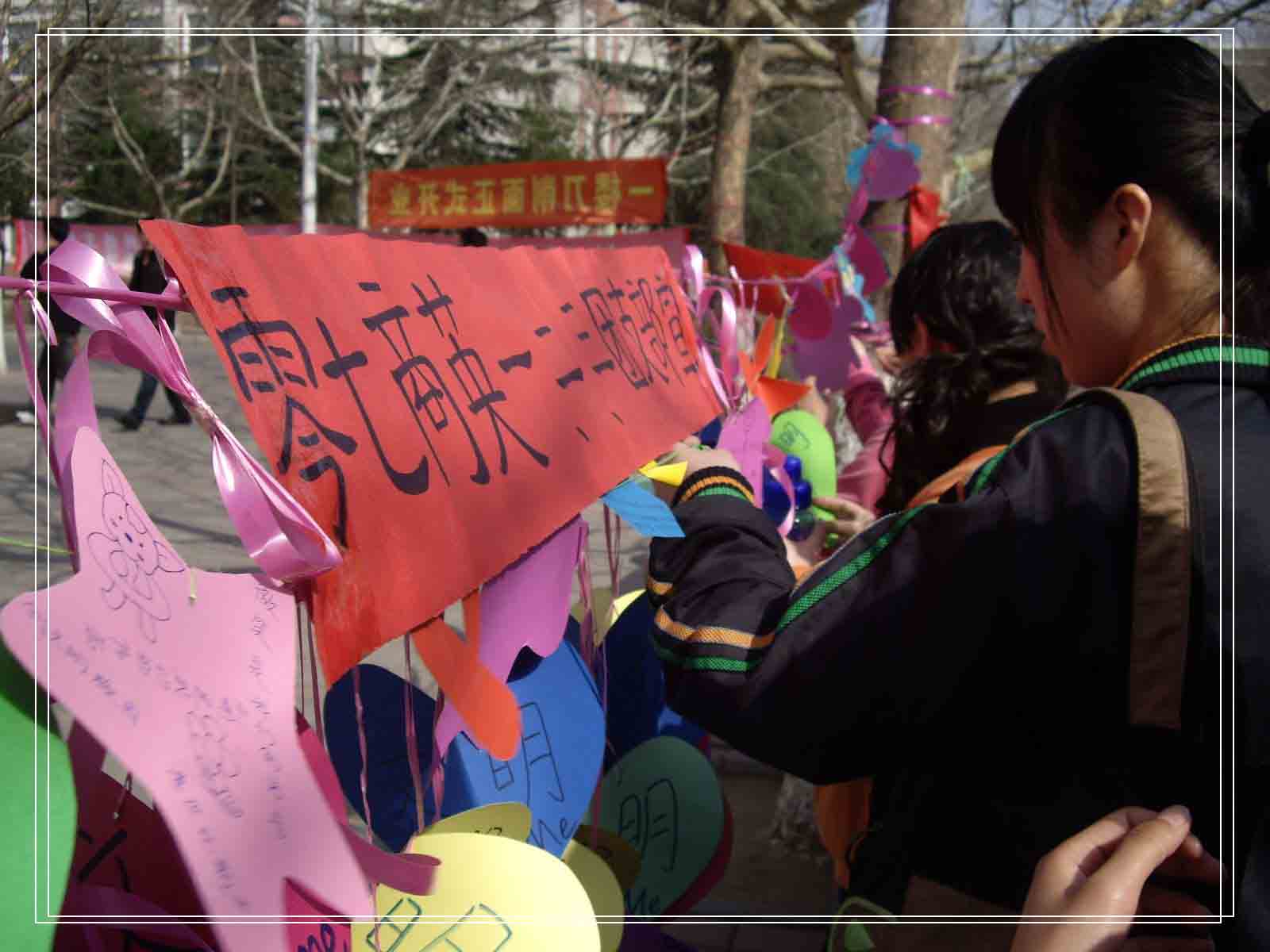3月19日,2班全体同学在龙湖报告厅楼下和07级商英1班、3班的同学们一道挂起精心制作的爱心小卡片,在每张小卡片上都写着关于文明礼貌的诗歌和名言警句,以期更好的向全院师生宣传文明礼貌。