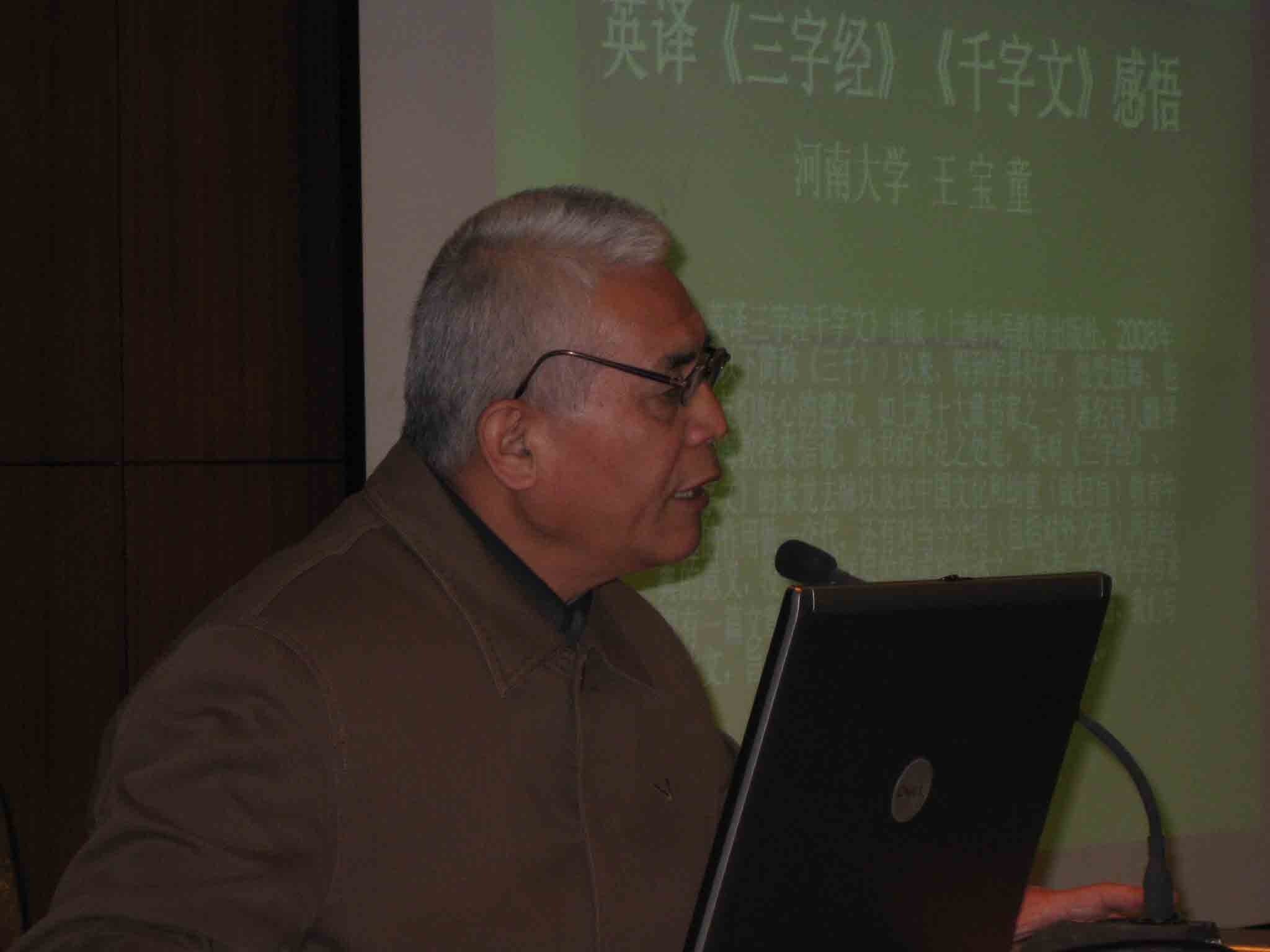 2009年3月26日下午,应我院外语系的邀请,河南大学外语学院博士生导师王宝童教授在我院外语一号楼二楼多功能报告厅作了题为《英译 < 三字经> < 千字文> 感悟》的学术报告。王宝童教授是全国诗歌翻译专家,河南大学博士生导师,出版译著、论著多部,其英诗汉译、汉语神话诗歌体翻译研究在国内处于领先地位。曾十年磨一剑,英译《王维诗百首》。系主任马秉义教授、全体教师、部分学生聆听了报告。外语系名誉主任申立教授主持了报告会。