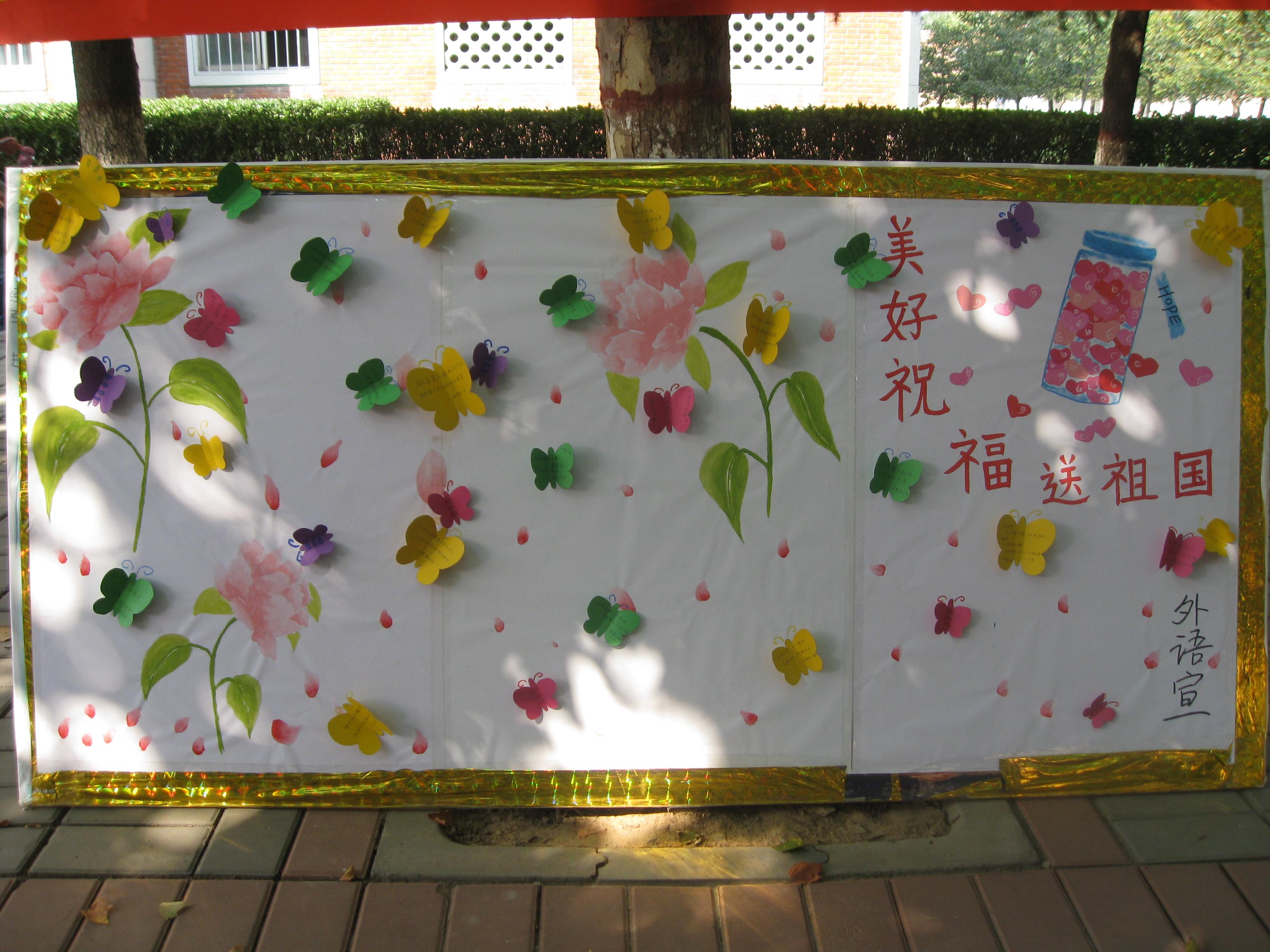 展板上红彤彤的牡丹花预示着祖国的锦绣前程,玻璃瓶满载的是我们莘莘学子的爱国之心,板面上满是翩翩欲飞的蝴蝶形卡片。卡片上记下的是外语人的心声,有来自07英语四班的“祝福伟大的祖国繁荣昌盛,人民安居乐业”,08商英五班的“六十年蒸蒸日上,新中国经久不衰”和09英语三班的“祖国六十年华诞齐欢乐,五十六个民族共欢腾”等等。一句句话语是同学们发自肺腑对祖国的祝福。