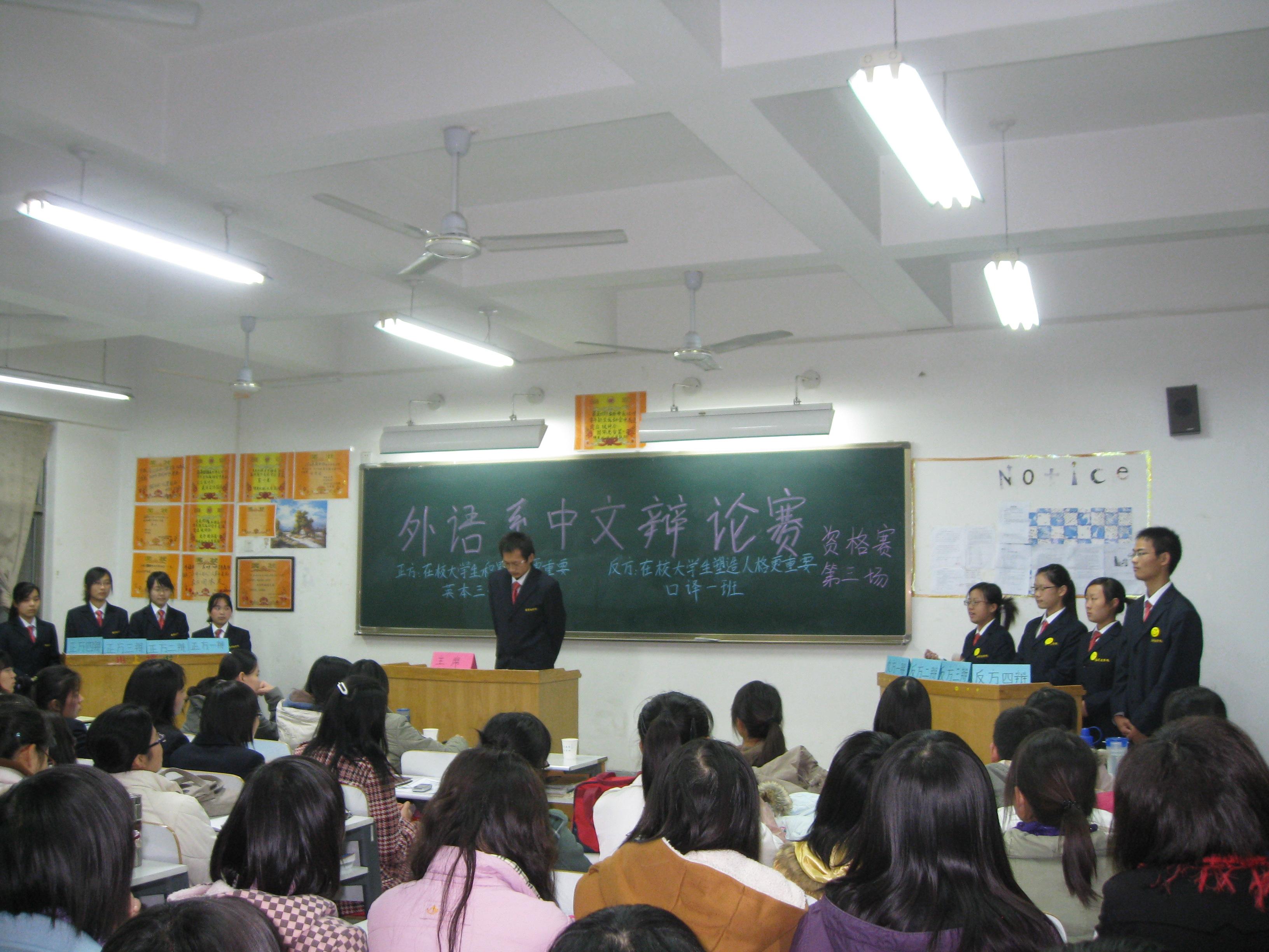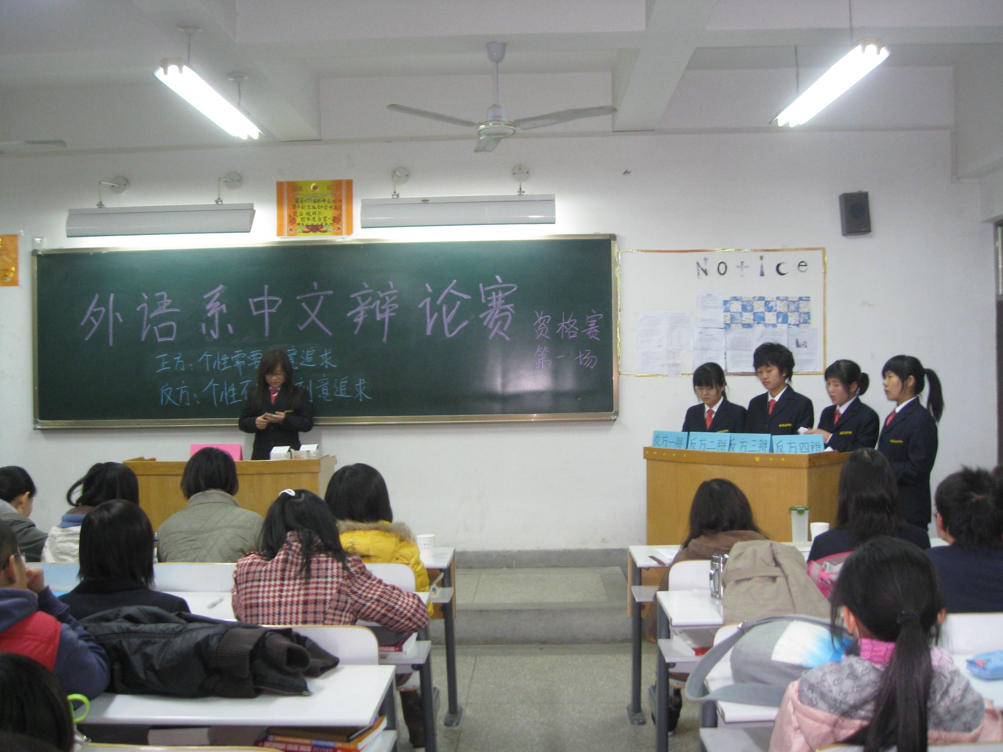 2009年11月12日晚6点30分,在外语楼A座407教室,由外语系学艺部举办的中文辩论赛资格赛迎来了最终两场。担任评委是外语系辩论队的闫慈、吴子婧和周恒等人。