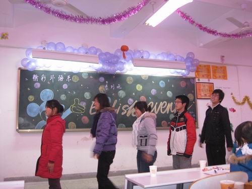 2009年12月9日晚上七点,在外语楼A座513教室,由外语系外交部组织联合09级日语一班和日语二班举办的“English Evening”隆重举行。本场晚会有幸邀请到的嘉宾有日语外教直樹和朋子老师,英语外教Ryan,外语系学生会主席乔羽和外交部部长魏雁楠。