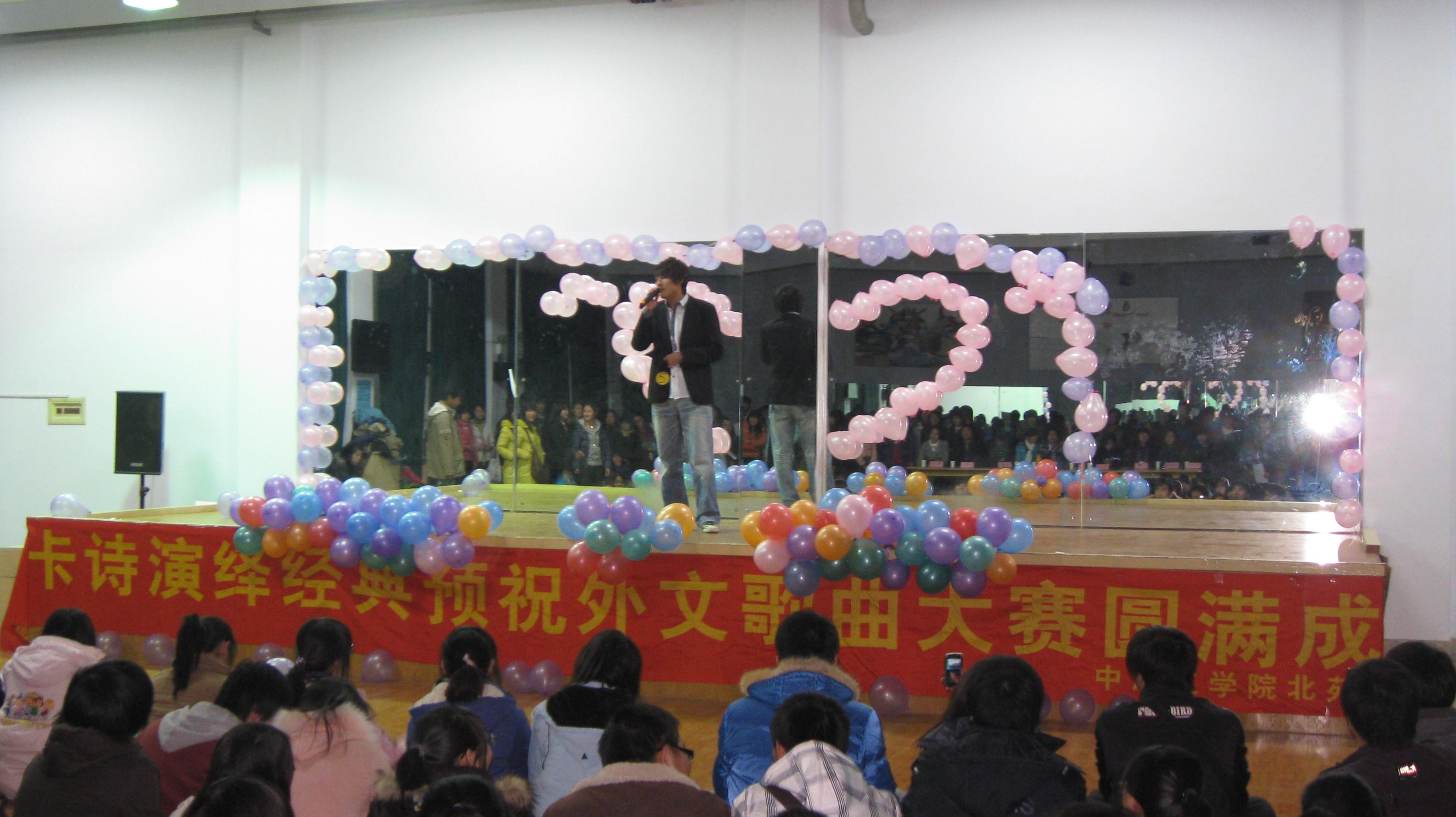 2009年12月21日晚上6:30在体育馆负一楼综合厅,由外语系文艺部举办的面向全校同学的外文歌曲大赛在此隆重举行。担任本次大赛的评委是外教Rico,外语系学生会主席乔羽、艺术系文艺部部长、上届院十佳校园歌手冠军李宇、亚军张芳。