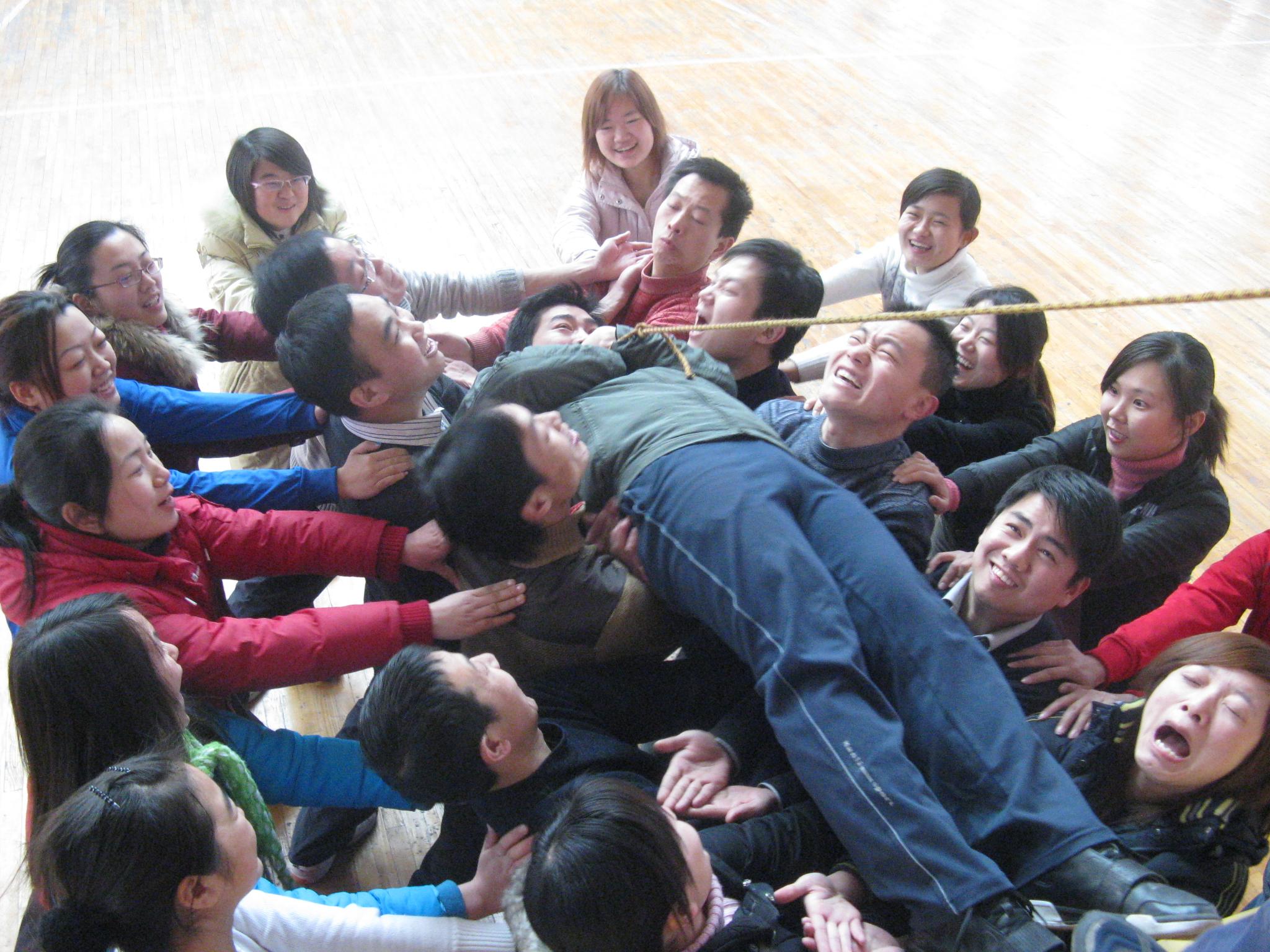 在“贴烧饼”的小游戏之后,大家的情绪被充分调动,现场气氛顿时活跃起来。全体参与队员,在教练的安排下,组成两队,集思广益,迅速确定了各队的队长、队名、队呼、队歌等,并进行了精彩的展示。之后,在两位教练的精心组织下,全体队员,时而分组竞争、时而团结协作,依次开展了 “信任背摔” “赢走”、“同起同坐”等团体或竞争项目。
