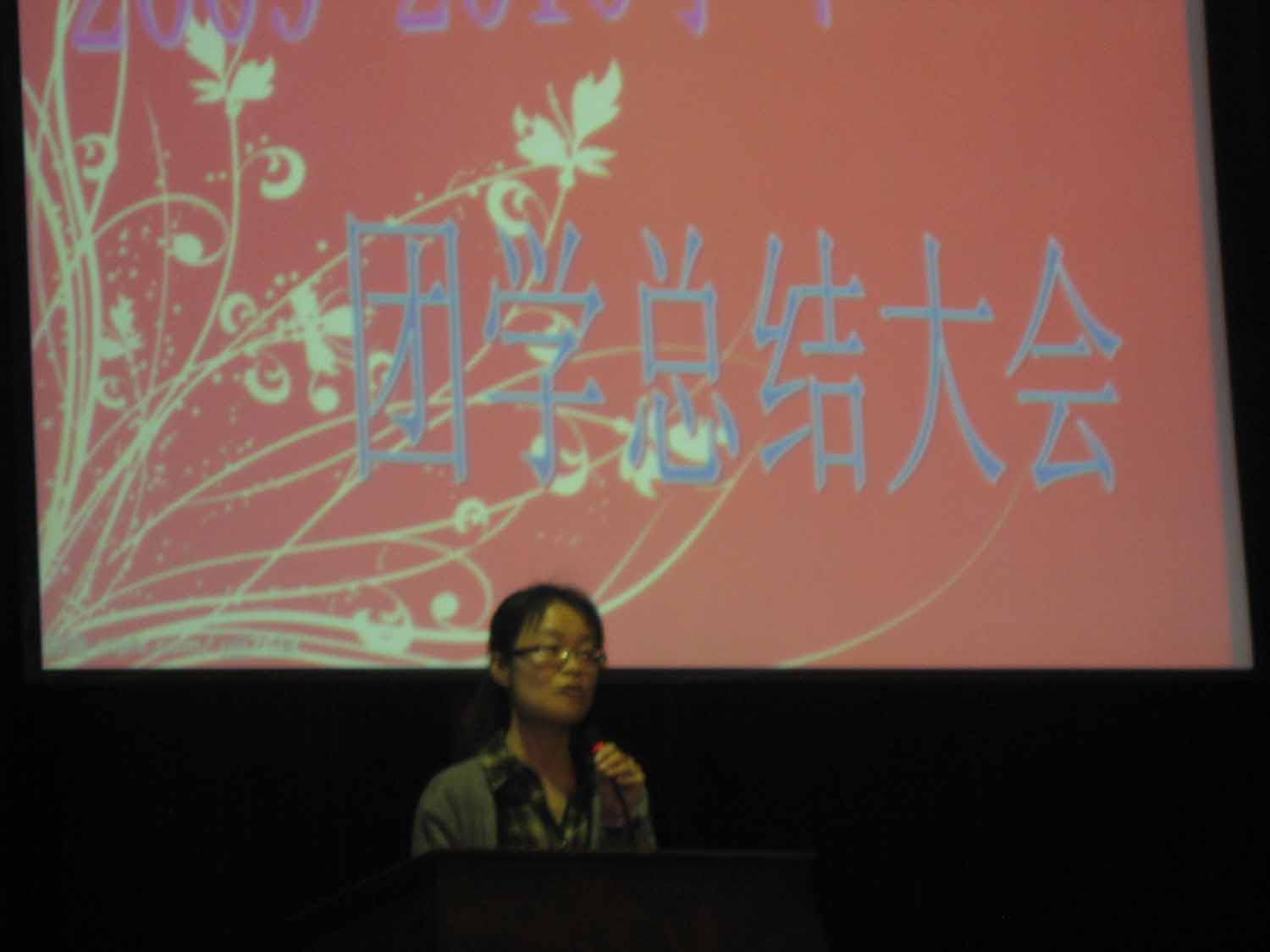 最后,团委书记惠凯赟老师做了大会总结发言。她以《和你一样》、《光荣》和《放手去爱》三首歌曲的主题和寓意为主线建议大家认真对待大学生活的每一个阶段,清楚自己的角色,找准自己的定位和目标;在肯定大家一年来的工作成绩的基础上,感谢团学各部门在过去一年中的辛勤努力的工作,并且鼓励同学们勇于进取,敢于发现,不断提高自身素质和能力,突破自己,强化团学组织的服务、管理和引导能力,促进工作的不断发展。