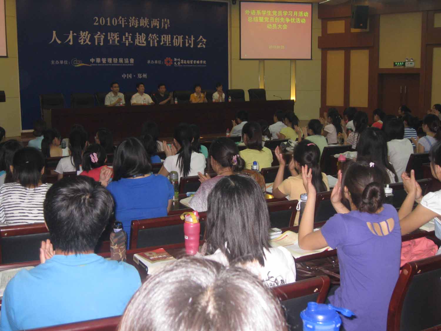 最后,戎书记做了总结讲话。戎书记首先对外语系“党员学习月”活动的开展给予了充分肯定,认为这是一项内容丰富,形式多样,效果明显,具有创新性的一次活动,通过活动的扎实开展,使每个党员在思想上、理论上、行动上达到新的高度。戎书记还强调了学习对组织建设及党员个人的重要性,并指出注重学习和与时俱进是我党的鲜明特点。他要求全体党员,要以此次学习月活动的开展为契机,要把学习月活动的圆满举行作为继续学习的动力,要致力于学习型组织的建设、成为学习型党员,并希望外语系党总支在党员创先争优活动的开展中做出更加优秀的成绩。