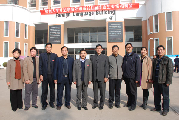 在学院各级领导的关心支持和帮助下,外语系2011届毕业生专场招聘会于11月18日顺利举行。招聘会当天上午,院长崔慕岳教授、戎庭银常务副书记、张金安副院长带领院办、总务处及招生就业处等部门主管领导莅临会场,亲切看望参加应聘的学生,慰问招聘单位人员,并听取他们对毕业生就业工作的意见。