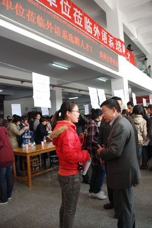本次招聘会,共有来自省内外37家企业到场招聘,并呈现以下四个特点。一是专业对口性强。在招聘会当天提供的397个岗位当中,对英语专业需求岗位共276个,日语专业需求岗位70个,两个专业岗位的需求量占到了总需求量的87%,充分体现了招聘会的专业性。二是校友单位多。现场有10家用人单位都是委派本单位毕业于升达外语系的学生返回母校招聘。三是成效显著,此次招聘会是我系就业服务月活动的重头戏,在11月份的就业服务月期间,我系共联系就业岗位462个,给2010届毕业生提供了良好的就业平台,据统计,招聘会当天,用人单位共收到了求职简历1328份,另有491名同学进入到了用人单位的复试。四是加强了我系与用人企业的交流与合作。招聘会当天,我系分别与郑州美国优先教育学校、郑州听道外国语培训中心签署了就业实习基地协议,同时与开封维康干冻食品有限公司、郑州联大外国语学校达成了签署就业实习基地的意向。为我系进一步做好毕业生就业工作,打开了新的局面。