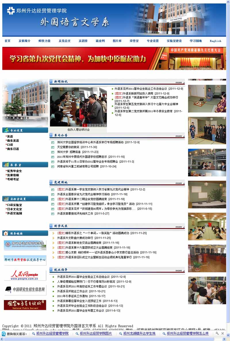 为了进一步加强对外语系的宣传,突出外语系特色,经过一段时间的筹备和制作,近日,外语系新版网站正式投入使用。与老版网站相比,界面更加明亮清新、内容更加丰富多彩。新网站在保留老版网站主要内容的基础上,新增加了更多的内容,更加突出了外语系“精外语、强听说、懂经贸”的特色。主网页同时显示系内教学、管理、党建、团建、就业等栏目内容,使访问者对外语系的基本情况一目了然。网站也新增了更多的图片内容和信息,对外语系专业设置、实验室建设、历年考研及竞赛荣誉等都进行了详细的介绍。