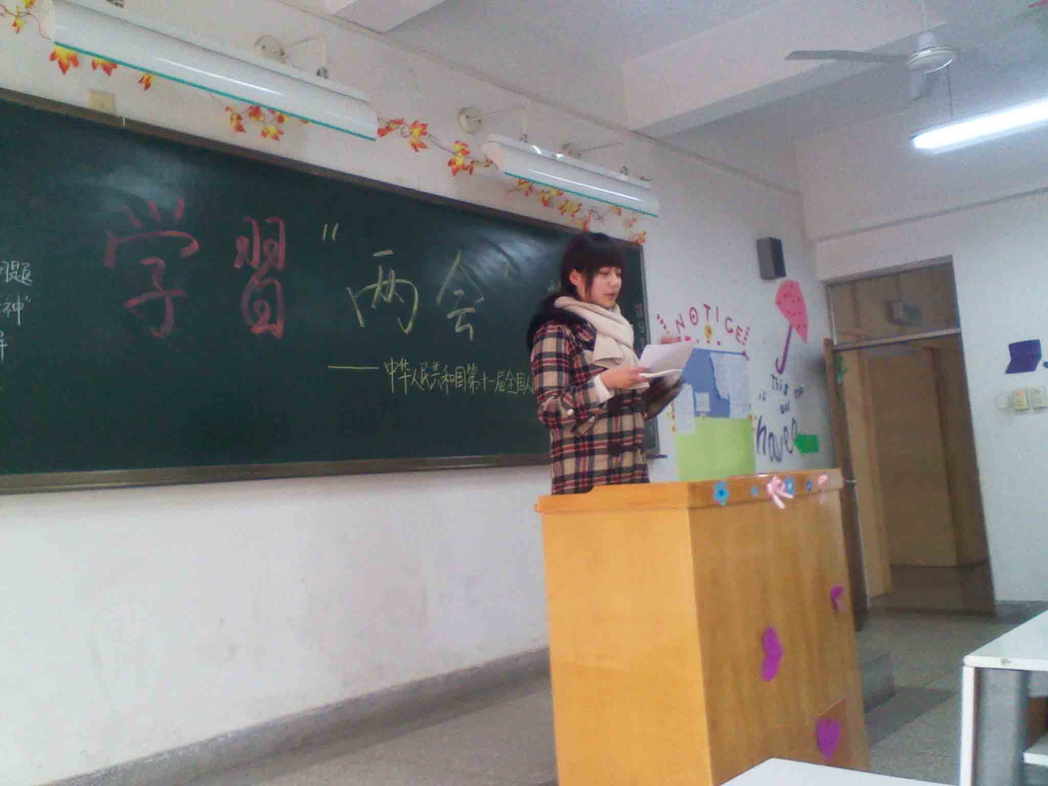 11级商英1班同学从《中国青年报》、《人民日报》上节选文章在班会上宣读,大家就“小悦悦”事件所反映的问题进行了激烈讨论,大家就新时期怎么助人为乐,什么是正确的价值观展开了讨论;10级日语班就大家关心的就业、文化强国等问题进行了讨论;09级口译1班的同学用双语学习的方式,了解两会知识,丰富了专业知识积累。