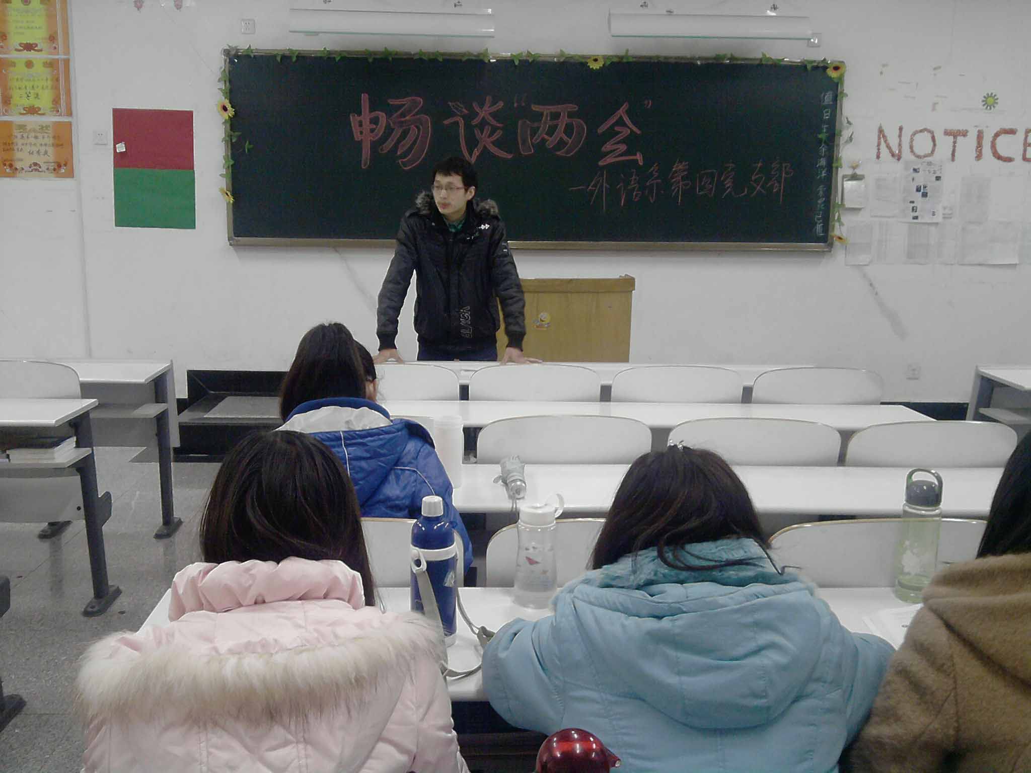 两会虽然结束,但广大党员对两会精神的关注和探讨依然在延续, 2012年3月22日下午,外语系第四党支部的支部在外语楼108教室开展了“畅谈两会”的主题讨论会,支部书记田倩倩及支部全体党员和预备党员参与了此次讨论会。