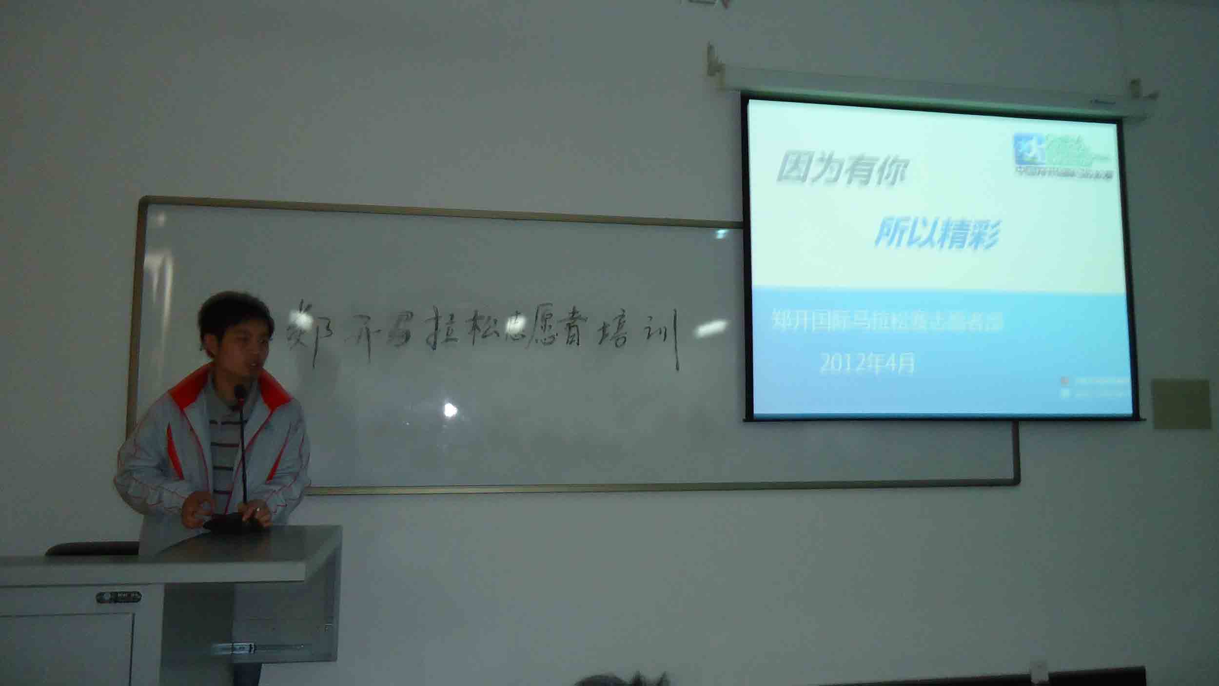 同时2012中国郑开国际马拉松赛组委会志愿者服务部的工作人员也来到了培训现场。他们通过PPT的形式声情并茂的向志愿者们详细讲解了郑开国际马拉松赛主要内容和注意事项,对志愿者服工作技巧和工作要求做了进一步的阐述。并针对我院志愿服务的相关事项做了具体部署。志愿者们认真听讲并积极向志愿服务部的工作人员请教,整个培训现场气氛活跃。