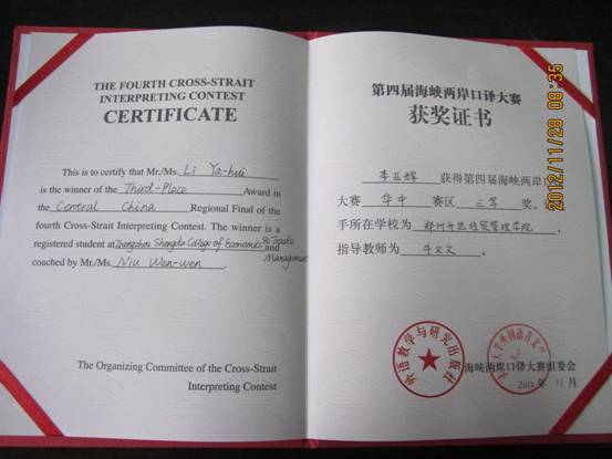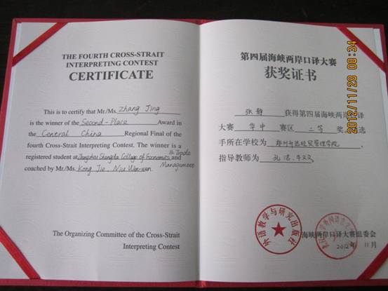 此次大赛是由厦门大学和外语教学与研究社联合主办,属于国务院台湾事务办公室重点交流项目规划。作为国内最权威的口译赛事,大赛采用专业的赛制和赛程,并邀请了国内口译界权威人士担任评委。参赛选手来自武汉大学、华中科技大学、中南大学、安徽大学等全国重点院校,其中,不少选手是口译专业硕士。一本、二本、三本高校之间,研究生和本科生之间,不同层次的选手同台竞技,高手如云,淘汰率高,竞争十分激烈。比赛分为主旨口译、对话口译及会议口译三个环节,对参赛选手的短期记忆力、口译技能、知识储备等进行考查,具有很大的挑战性。最终,三位选手凭借着扎实的语言基本功和娴熟的口译技巧,取得了好的成绩。值得一提的是,河南省参与本次大赛的五所高校(河南科技大学、中原工学院、中原工学院信息商务学院、河南财经学院成功学院及我院)13名选手中,我院外语系张静同学成为名次最高的选手,是河南省参赛选手中唯一获得二等奖的选手。