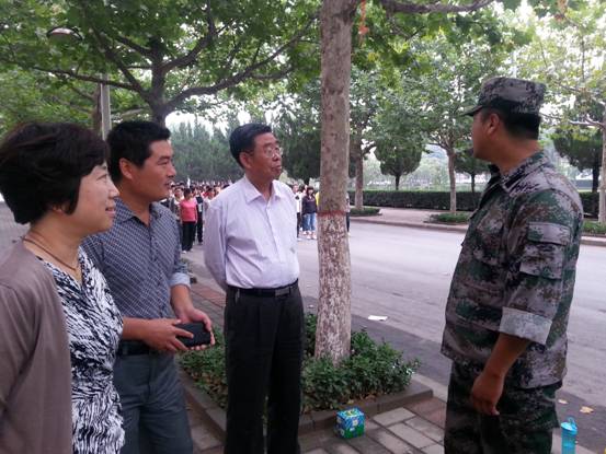 9月9日下午,外语系主任马秉义教授,乔卫书记在石皓召副书记和行政秘书惠凯赟老师的陪同下深入军训现场,看望了2013及军训新生和教官。
