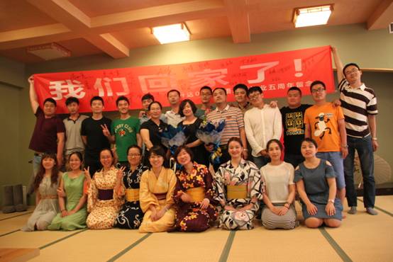 06日2班共53名同学,本次返校23名,大家从北京、上海、广州、南宁及河南各地克服种种困难再次相聚升达园,一起游览了久违的校园,品尝思念已久的美食;一起回到主教室,再次聆听老师的教导;一起参观日本文化室,和学弟学妹们分享五年来的工作生活感悟,体验日本和服、枯山水式园林;一起聚餐、一起卡拉OK……重温大学温馨时光,创造新的美好回忆。他们还特意为聚会精心制作了微信图片邀请函、纪念条幅和纪念水杯。