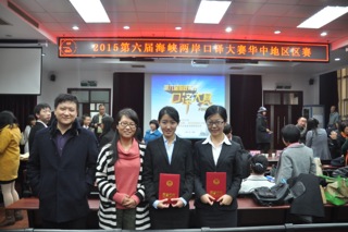 11月14日,第六届海峡两岸口译大赛(华中区赛)在华中科技大学举行。我院外语系闫冰、牛文文老师带领12级口译二班柴芸蕾和12级英本四班王雪同学,在湖南、湖北、河南、安徽四省参赛24