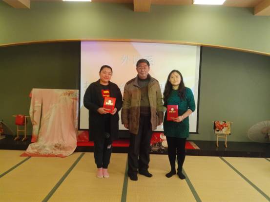 会议还对2015年度招生宣传工作的先进个人进行了表彰。通过认真的讨论和研究,依据《外语系招生宣传奖励办法》,33名同仁分获招生宣传一、二、三等奖。张洁副院长、刘景向处长和马主任分别向获奖的先进个人颁发了荣誉证书并合影留念。