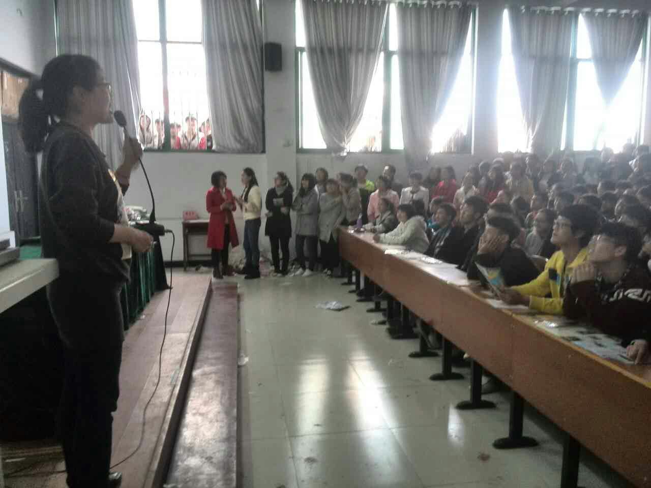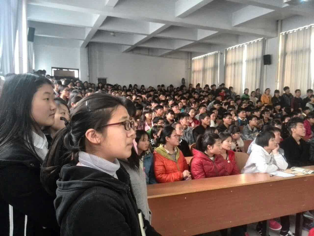 在兰考一高巡讲中,学生反映热烈,报告厅座无虚席,300多名高三学生挤满了过道两侧,还有一些学生趴在窗户外面认真的听,报告过程中无一人中途退场,同学们积极回答问题,频频互动。在日语的互动展示环节,有多名学生主动站起来说日语,例如“你好”、“早上好”“初次见面,请多多关照”等这些他们自学来的日常问候语。报告结束后还有十几位同学留下来咨询,并继续向洪艳荣老师请教日语,有的同学更是专门ps了图片表达对洪艳荣老师及学习日语的喜爱之情。