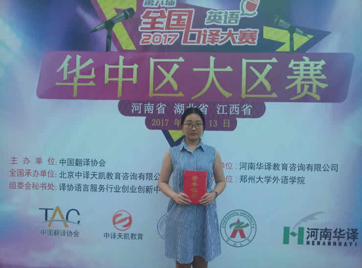 我院代表队经过河南省赛区的洗礼,尚璐莉、鹿英在河南赛区脱颖而出,进入到华中区的大区决赛。参加此次大区赛的选手来自华中三省(河南、湖北、江西)各大高校,其中不乏武汉大学,华中科技大学等重点大学的参赛选手。比赛过程精彩纷呈,竞争十分激烈。比赛分为淘汰赛和排位赛两个阶段,赛题较复赛更是增加了难度,非常考验学生的口译功底。比赛环节的设置对参赛选手在语言转换能力、信息处理能力和现场应变能力、知识储备等方面具有很大的挑战性。我院代表队的尚璐莉同学,先是在淘汰赛中脱颖而出,进入到排位赛。在排位赛中,尚璐莉趁着冷静,不畏强手,依靠过硬的实力和精彩的表现,最终获得三等奖,为学院和系里争得了荣誉。