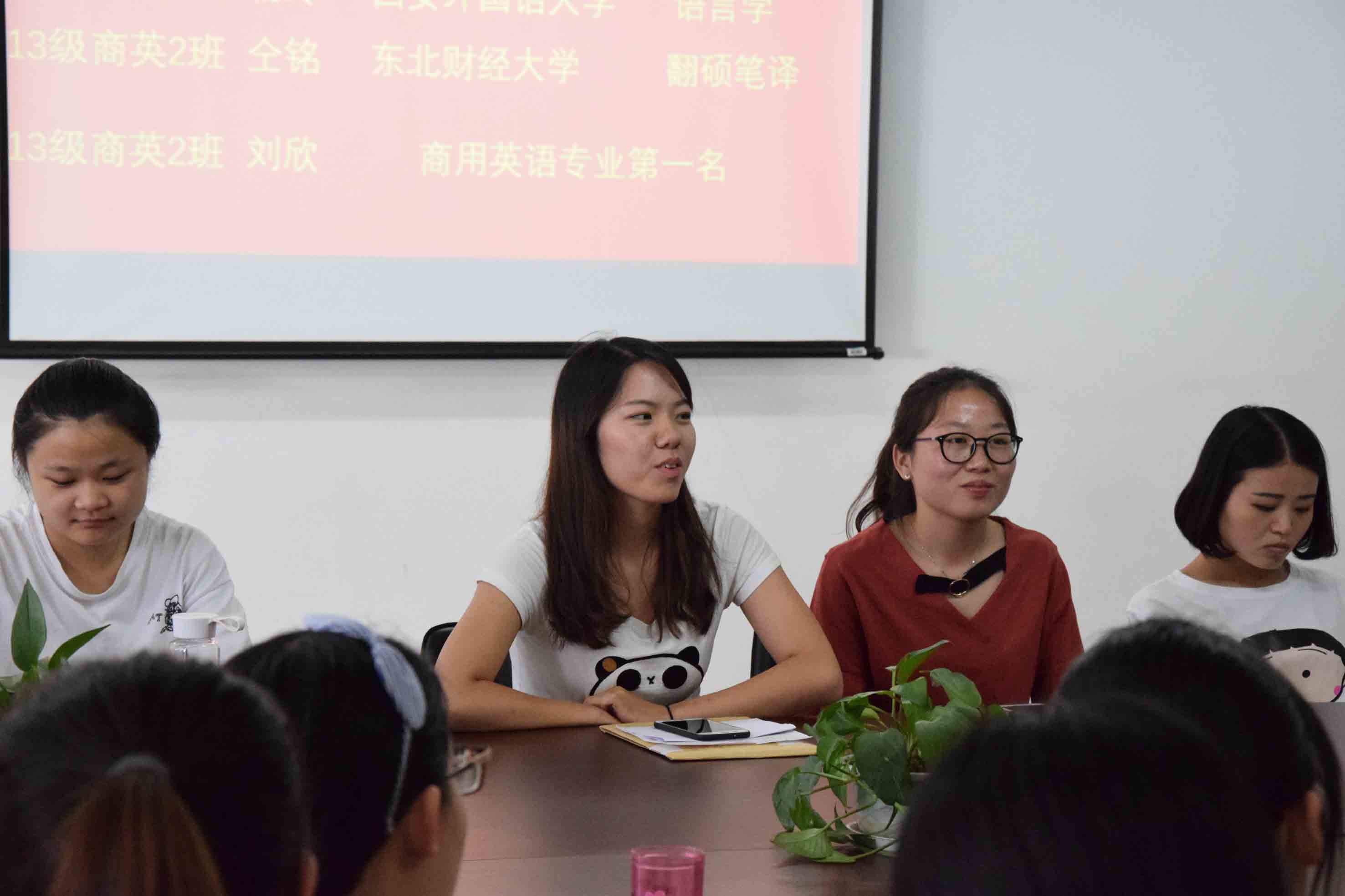 首先是程彬学姐 ,她侃侃而谈,为大家介绍了许多考研的学习方法, 她提到最重要的还是要努力学习, 刻苦学习,面临崩溃,甚至忧虑和紧张的时候一定要调整好心态,绝佳的心态也是考试的法宝 ,也正是她这种不放弃学习的念头造就了她的成功。第二位是姬甜梦学姐,她是外语系的一个传奇,这位学姐在日语能力测试N1中考了满分,学姐说学习最重要的是兴趣,确定目标就努力去做到最好,还有就是一定要有自信,这样才能给老师们一个好的印象,基础要稳扎稳打,也正是她的自信与努力造就了她的成功,第三位学姐是杨玲,她讲的更多的是考研的学习方法,还有些在考研中会遇到的问题,为我们指明了道路的方向。第四位学姐仝铭,她说到学习的时候找一个研友也是极其重要的,两个人可以互相鼓励,同舟共济,一起摸索,共同见证对方的成长,一起熬过这个艰难的岁月,共同分享成功的喜悦,她还谈到了自信问题,要保持自信这样才会让老师对你刮目相看。