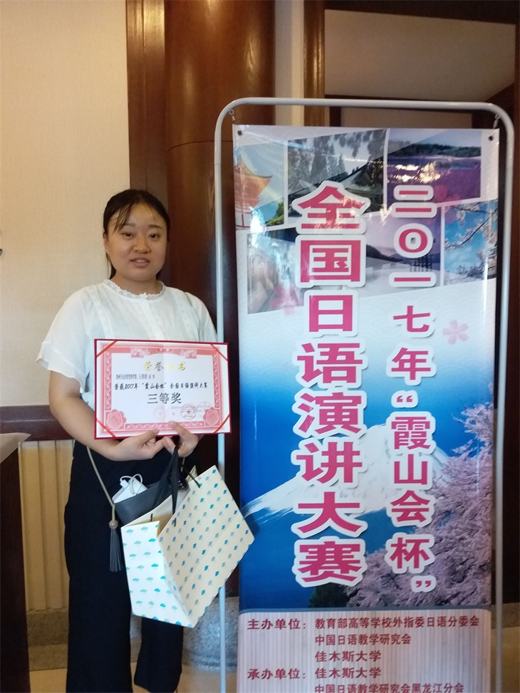 2017年7月12日,2017年霞山会杯全国日语演讲大赛在佳木斯大学举行。我院日语专业2016级王俏俏同学取得了三等奖的优异成绩,指导教师张宝红老师获得“优秀指导教师奖”。
