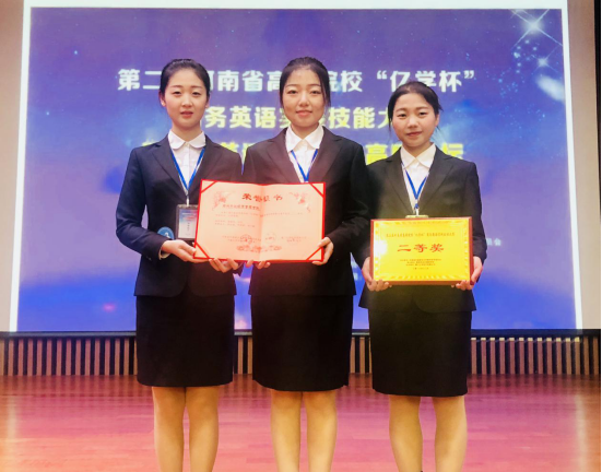 近日,第二届河南省商务英语专业建设高层论坛暨“亿学杯”商务英语实践技能大赛在黄淮学院举行。我校全球十大网赌正规官网商务英语教研室的白光和张华嵩两位老师受邀参加此次论坛,并带队参赛。经过与全省20支参赛队伍的激烈角逐,我校由2015级英语(商务英语方向)本科班田婷婷、刘晓丽、郭金丽三名同学组成的代表队获得商务英语实践技能大赛二等奖。
