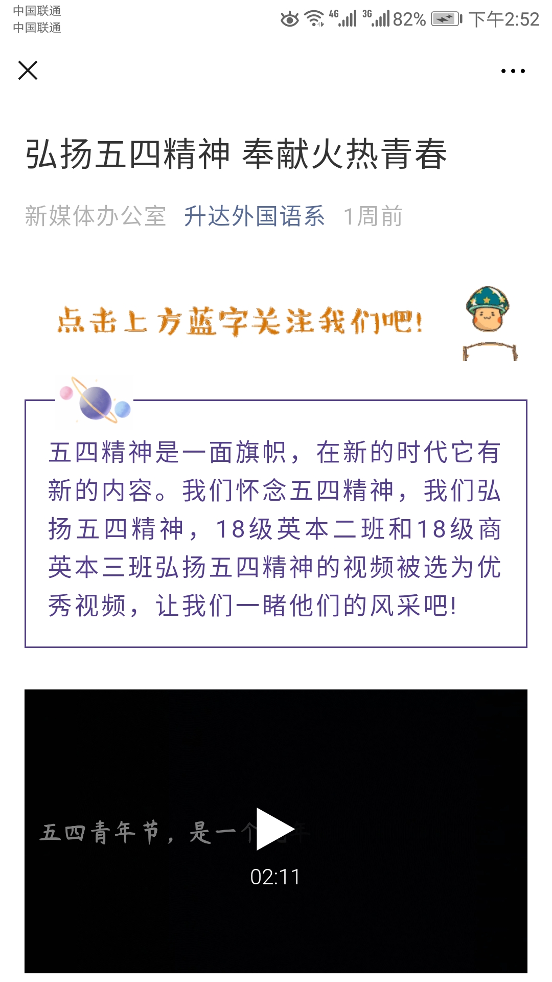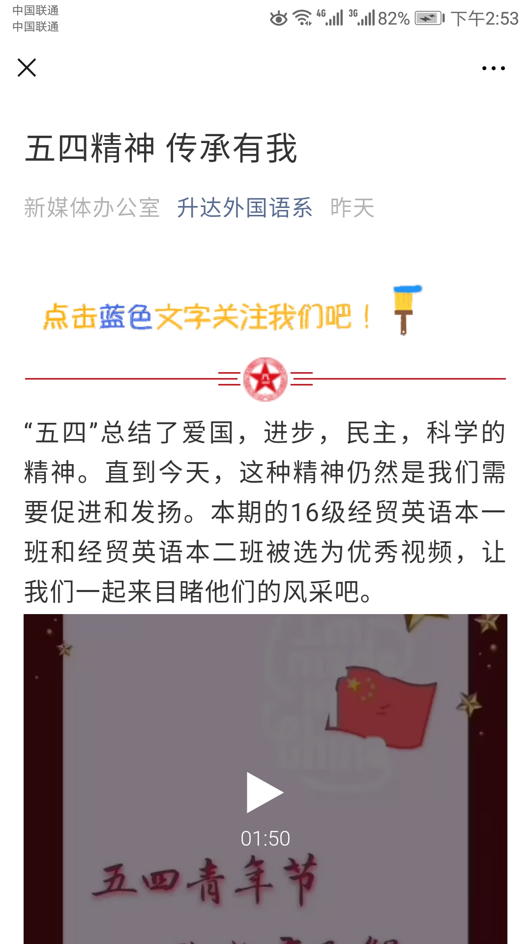光辉的五四运动被载入史册,他所展现出来的爱国主义精神,他所咏唱出来为民族安危奋起抗争的浩然壮歌,激励了一代又一代青年学生。今年是五四运动一百周年,外语学院团委,组织团员青年用视频的方式表达心声,并将各团支部制作的视频自4月16日起在微信公众号上分三期进行展播,受到广大团员青年的欢迎。