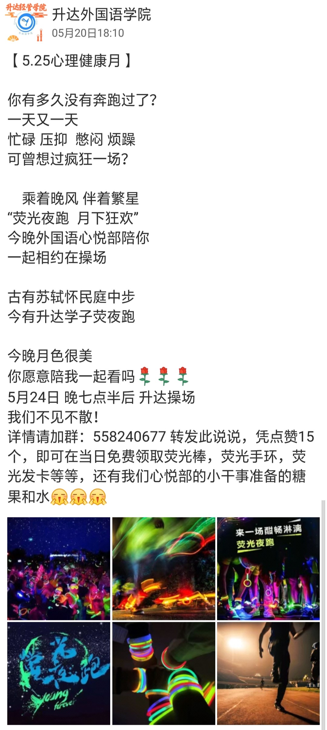 此次荧光夜跑活动契合“筑梦青春,追梦成长”主题,践行身心同行的理念,突显当代大学生积极向上风貌,对促进同学们身心健康成长具有积极意义。(外语学院 赵艳娜供稿)