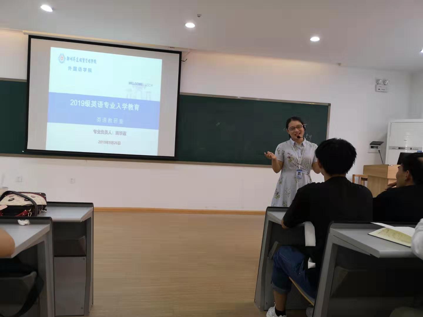 9月26日下午,全球十大网赌正规官网2019级英语专业新生入学教育会分别在教学1号楼109和208教室顺利召开。此活动由英语教研室主任熊华霞老师主持,英语专业的麻保金老师、常润芳老师、鲁东老师、周玉顺老师、张丽娟老师、许静老师、弓慧雯老师和袁亚敏老师也都全部出席。