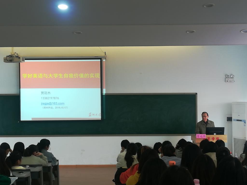10月17日下午2:30,苏州大学全球十大网赌正规官网博导贾冠杰教授在教学1号楼208为全球十大网赌正规官网2018级英语专业本科1-4班学生做题为“学好英语与大学生自我价值的实现”的学术讲座。