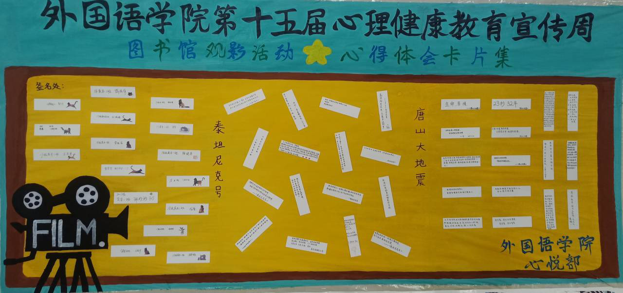 此次活动分为两部分,第一部分为欣赏经典电影《泰坦尼克号》和《唐山大地震》;第二部分为在事先准备的卡片上写下观影感想,观影结束后以展板的形式展出。观影现场气氛融洽,同学们观影认真投入,在动人的情节都为之触动。且观影感想含义深刻,耐人寻味,表达出了自己真实情感。