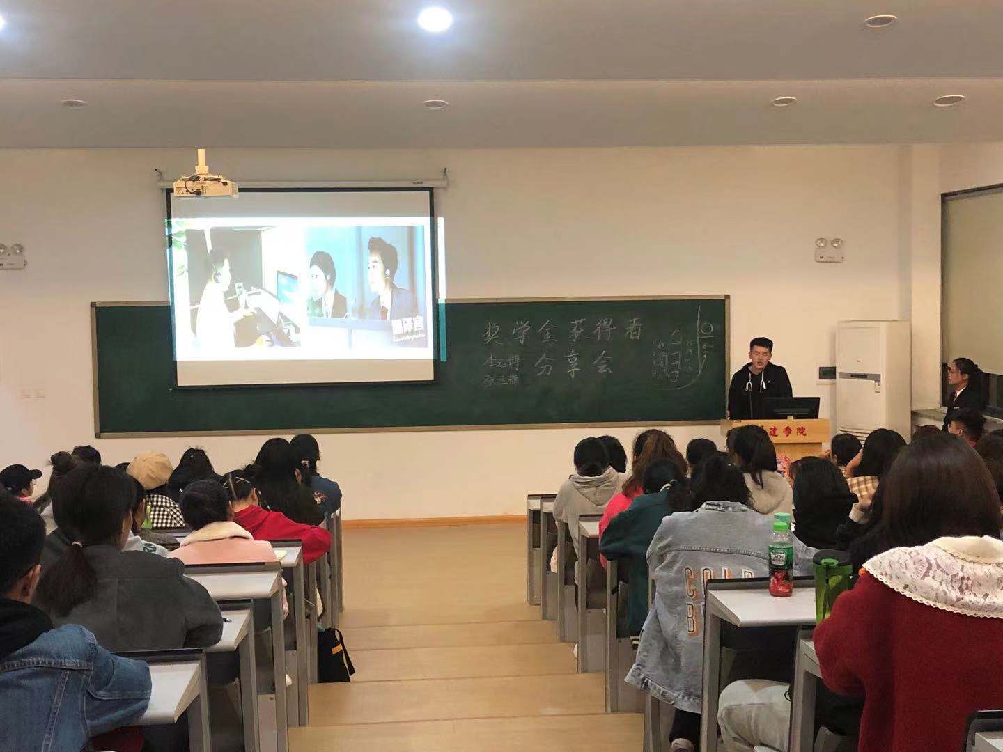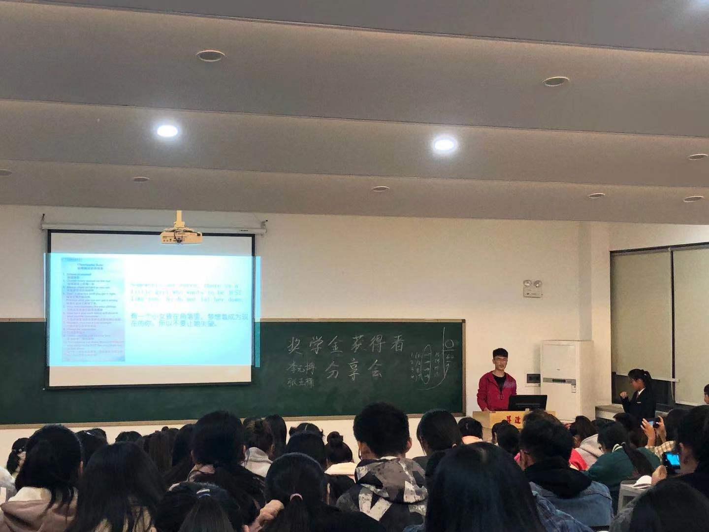 分享会在同学们热烈的掌声中展开,首先主持人通过PPT形式向我们介绍了两位学长在校期间获得的奖项与荣誉,引来同学们的赞叹敬佩之声。