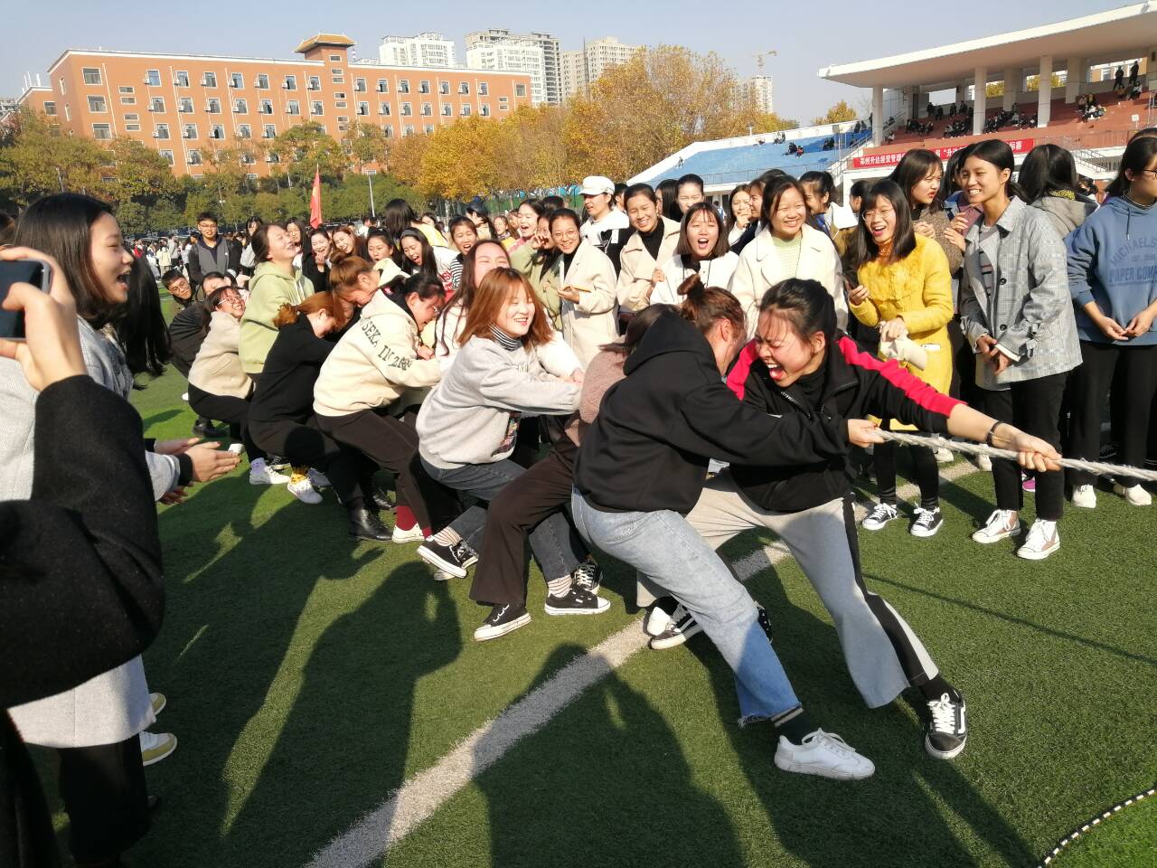 天气虽凉,准备比赛的同学们个个摩拳擦掌,跃跃欲试。田径场上的加油声、呐喊声响彻整个校园。此次比赛分三轮进行,共有12支队伍参赛。各班队员们团结一心使出“洪荒之力”,经过了激烈的耐力和体力的比拼,18级商英本二班和日语一班进入了决赛。两支队伍为了争夺冠军的头衔,展现出顽强拼搏和永不言弃的精神。场下的同学们也个个热情高涨,自发组成啦啦队,加油呐喊声此起彼伏。最终,经过激烈的对抗,18级商英本二班拔得头筹 。