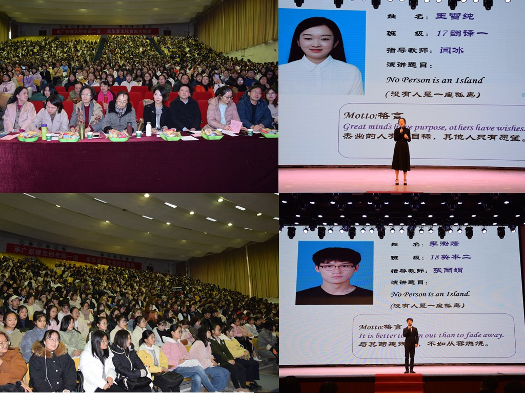 为了给同学们一个更好的展现自己风采的舞台,激发广大学生学习英语的热情,提高同学们对英语口语的兴趣,我院于2019年11月28日下午两点半,在思源会馆举办2019英语演讲比赛。张梦院长,崔瑾英副院长,赵文静老师,鲁东老师,王璨老师,张华嵩老师,闫冰老师、张保培老师,杜小芳老师和靳筱筱老师担任评委,院党总支石皓召书记,行政秘书惠凯赟老师和全体教职员工与2000余名在校生一起观看了比赛。比赛由李渤峰和李二巧两位同学主持。