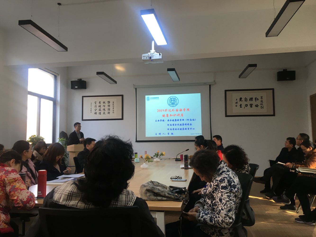 近日,外语学院工会特邀请河南省安全健康教育中心宣教科主任李凯老师为全体教职员工做了一场关于校园内突发性事故及突发急症的院外自救互救知识,教职工常见性疾病,职业性疾病及慢性疾病的预防与改善以及环境污染的危害与防护为主题的安全健康教育知识讲座。