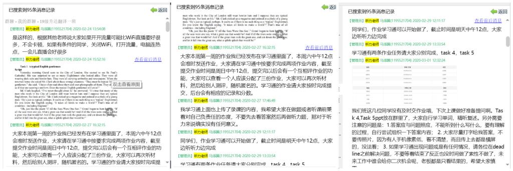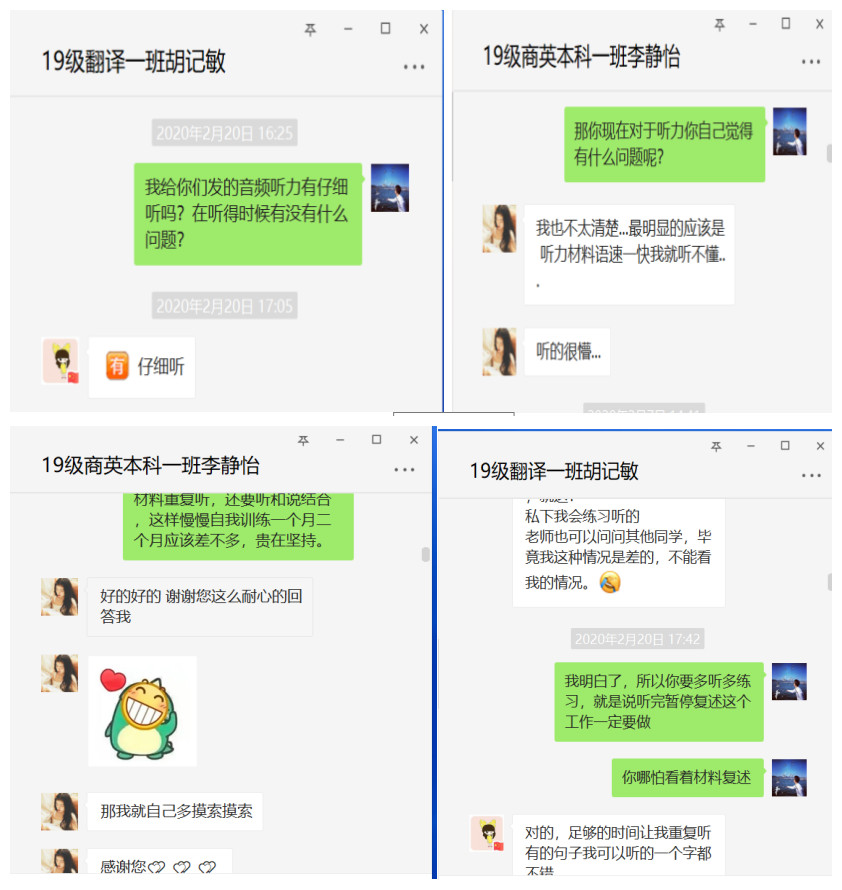 开课前的一周,马老师为了能使学生们充分了解网络课程授课方式,使自己能够在后期直播中得心应手,跟学生一起多次进行了直播试播课。钉钉是直播的主战场,qq微信群则是大后方。通知学生上课---布置相关作业---提醒学生上交作业---回复批改意见,每日的消息铺天盖地,虽然有时身心俱疲,但是看到学生们的进步,马老师心里的喜悦油然而生。直播的课堂无法像往常教室上课那样,监督到每位学生的上课状态,为了缓解学生们网络课程的疲惫,缩短与他们心灵之间的距离,在课前,颇有文艺天赋的马老师有时会为他们高歌一曲,既放松了自己的心情,也和学生拉近了距离,收获了一批小粉丝,学生们看着可爱的马老师,都亲切的称呼他为“小马哥”。课堂上,学生们发在屏幕上的一个个小心心,一个个小火箭,代表了他们的认可和赞赏。