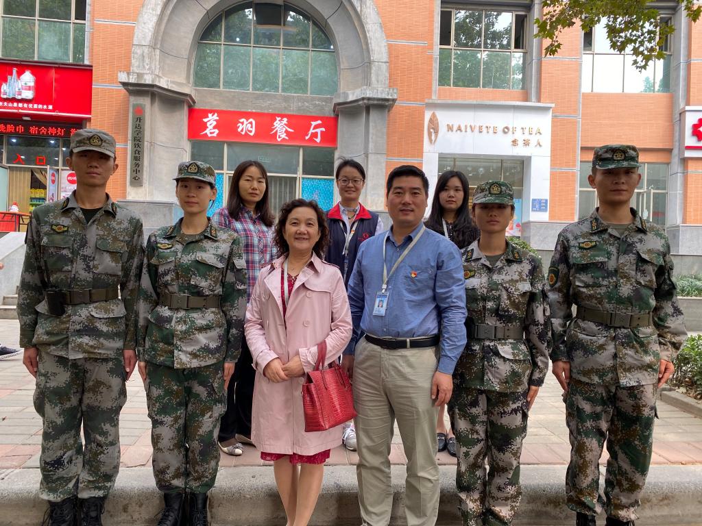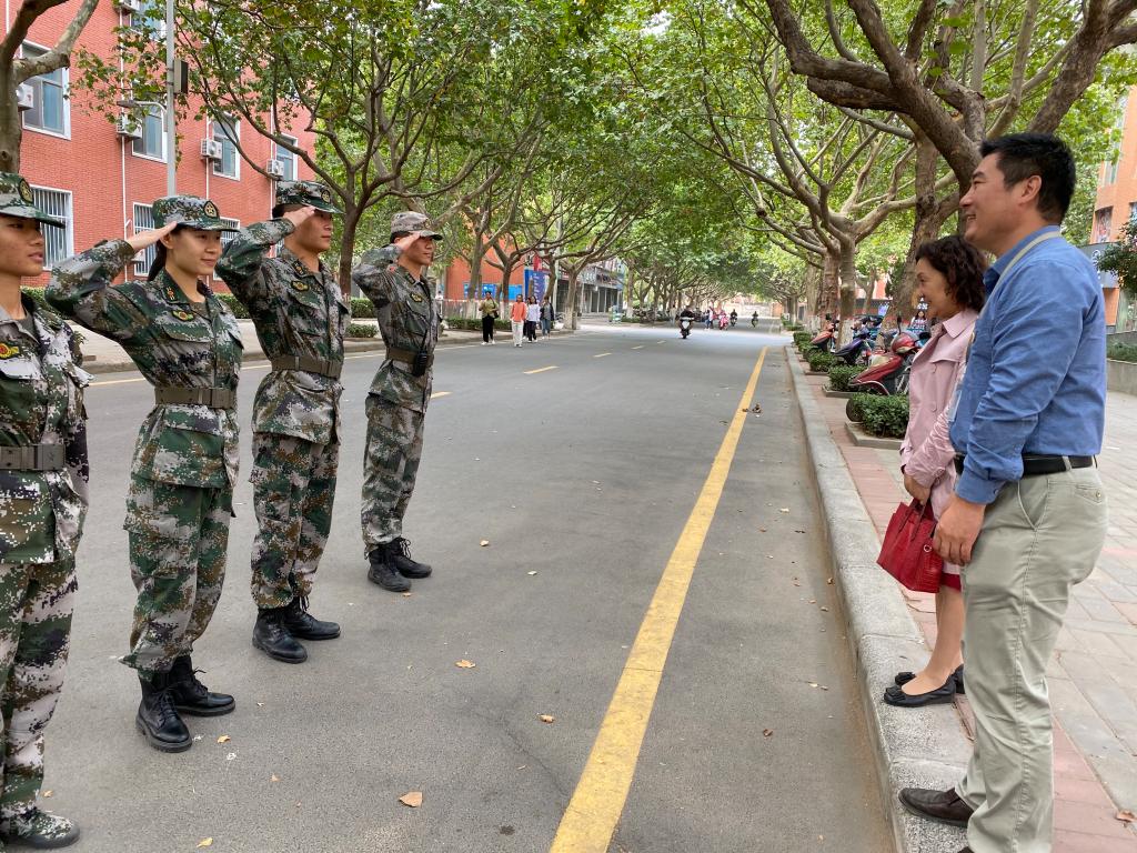 9月30日上午10时许,外语学院院长张梦教授、党总支石皓召书记在行政秘书惠凯赟以及新生班辅导员赵丽红、徐飞飞陪同下一起深入军训场地对教官进行了亲切的慰问。