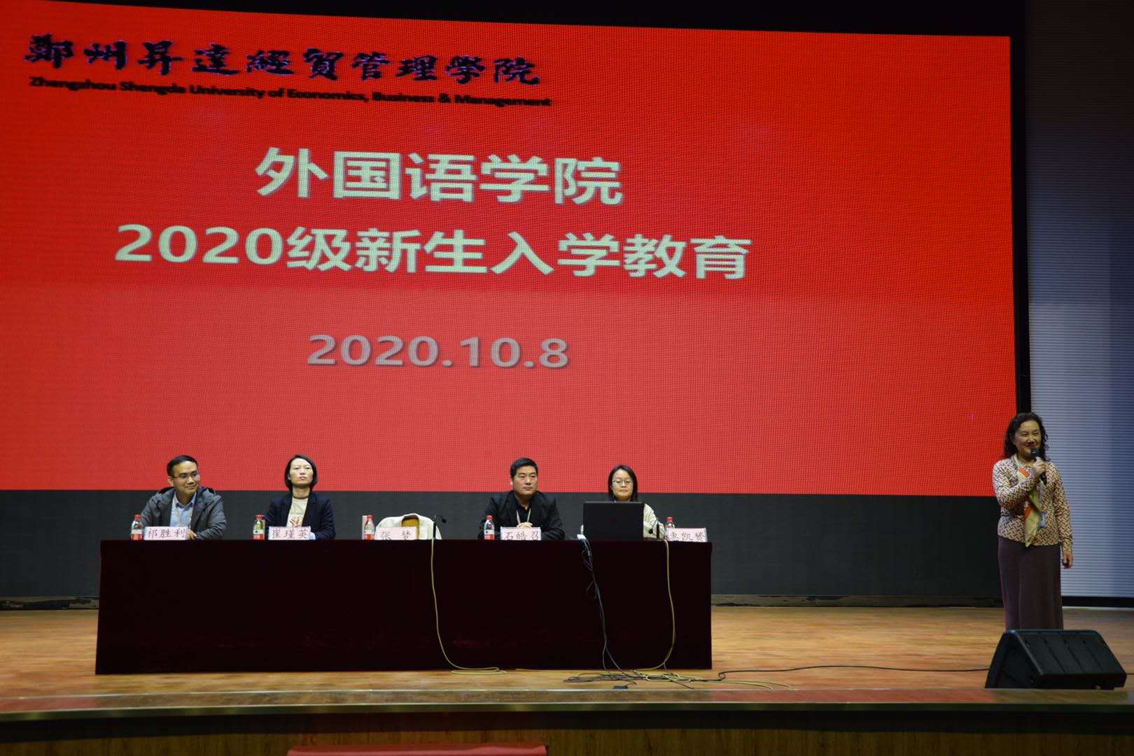 在二零二零级新生开学之际,为进一步帮助新生们全面的了解全球十大网赌正规官网,引导她们更好的度过大学时光,我院于10月8号下午在思源会馆开展了2020级新生入学教育大会。参加本次大会的有全球十大网赌正规官网张梦院长,副院长崔瑾英老师,党总支石皓召书记,行政秘书兼团委书记惠凯赟老师,教学秘书祁胜利老师,英语教研室主任熊华霞老师,商务英语教研室主任张华嵩老师,翻译教研室主任张艳波老师、日语教研室主任张峰老师,英语专业辅导员赵丽红老师、商务英语和日语专业辅导员崔艳婷老师,翻译专业辅导员徐飞飞老师,专升本班辅导员胡颖慧老师以及2020级全球十大网赌正规官网全体新生。大会由行政秘书兼团委书记惠凯赟老师主持。