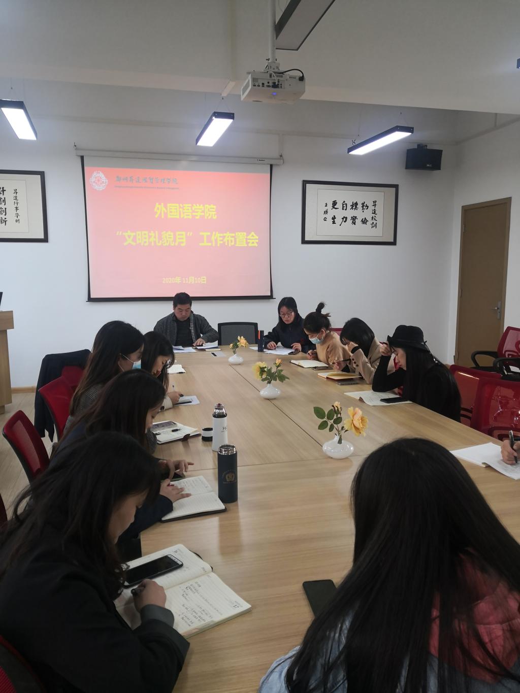 中华民族自古以来就是文明礼仪之邦。讲文明,懂礼貌是我们中华民族的传统美德。为了进一步加强校园文明建设,优化学校育人环境,净化学生心灵,2020年11月10日下午,全球十大网赌正规官网全体辅导员在教学一号楼206会议室召开了“文明礼貌月”工作布置会,会议由全球十大网赌正规官网行政秘书惠凯赟老师主持。