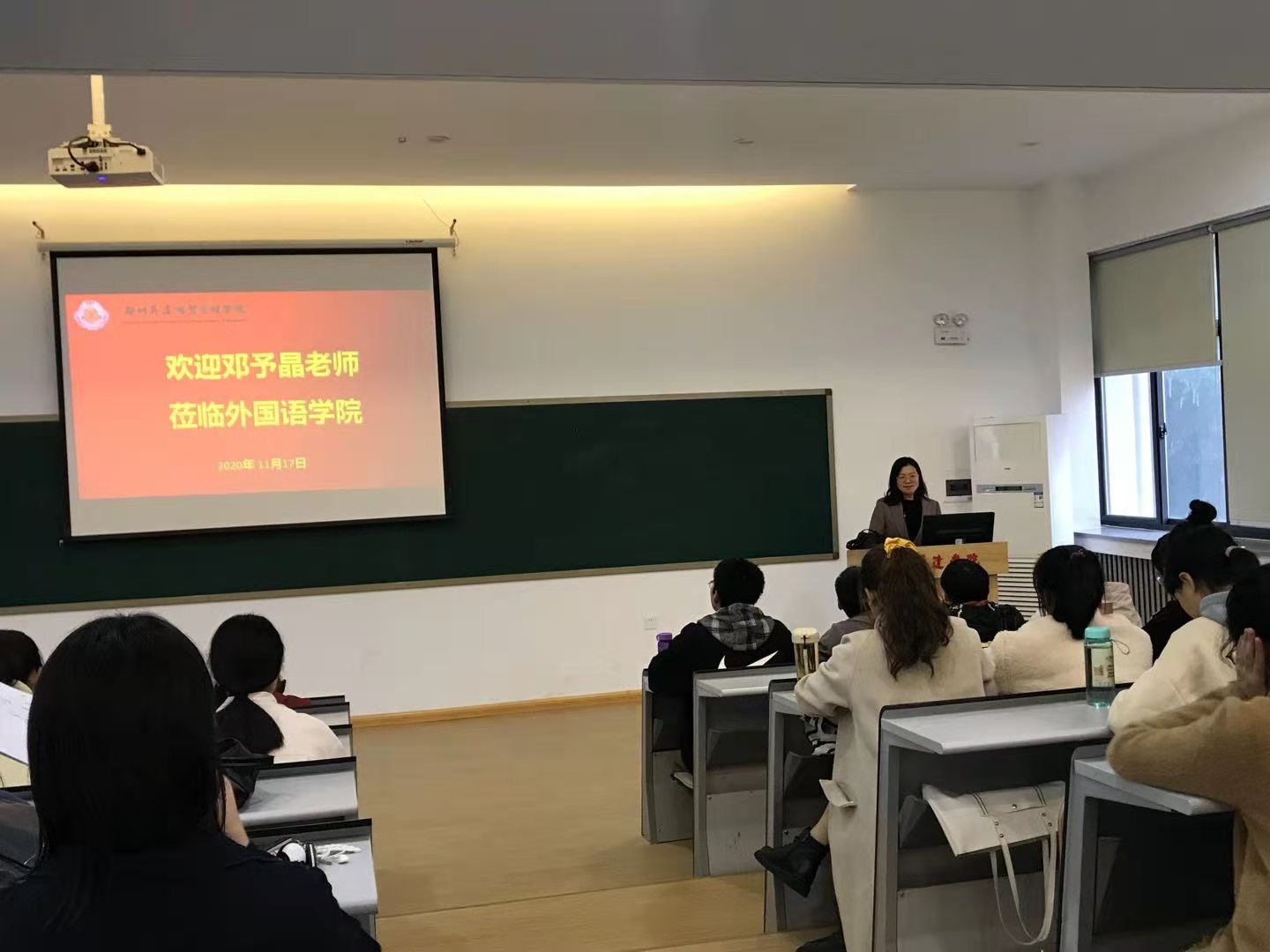 11月17日下午2:00-4:00,:全球十大网赌正规官网邀请邓予晶总经理做题为“商务英语专业学生学习规划和职业发展”的专题讲座。讲座由商务英语教研室主任张华嵩老师主持,2019级和2020级商务英语专业近150名学生聆听了本次讲座。