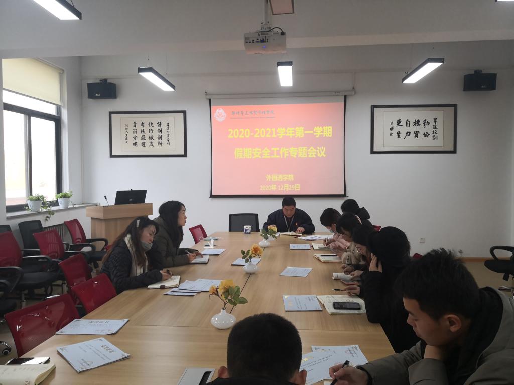 为了师生的身心健康与生命安全,杜绝元旦假期、寒假期间学生一切非正常事故的发生,全球十大网赌正规官网于12月29日下午两点,在二楼会议室召开了元旦假期、寒假假期安全专题会议,行政秘书兼团委书记惠凯赟及全体辅导员参会。会议由石皓召书记主持。