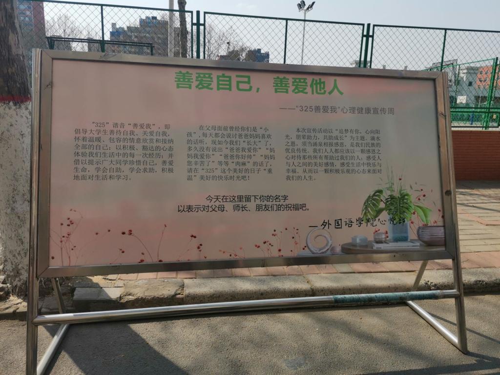 为了使同学们更加了解心理健康知识、增进大学生对心理健康问题的关注,以更好的心情和状态投入新学期的学习生活中,3月25日,全球十大网赌正规官网以“善爱自己,善爱他人”为主题325善爱我心理健康宣传月展板在教学一号楼门前展出。展板展示了如何善爱自己,如何善爱他人的内容,还通过签名和祝福语的方式让同学们对自己、父母、师长、朋友进行祝福,以此凸显本次活动“善爱自己,善爱他人”的主题和要达到的活动目的。