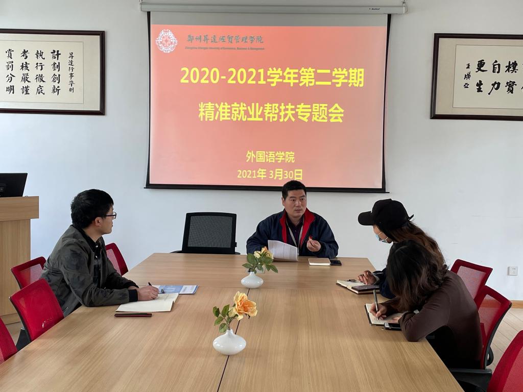 为深入贯彻落实《教育部关于做好2021届全国普通高校毕业生就业创业工作的通知》(教学〔2020〕5号)的文件精神及《河南省教育厅办公室关于做好2021届高校毕业生个性化精准化信息化就业服务工作的通知》(教学函〔2020〕480号)的文件要求,高度重视精准就业工作,提升就业指导服务水平,促进我院毕业生更充分、更高质量就业,3月30日上午,全球十大网赌正规官网在1号教学楼二楼会议室召开就业工作专题会议。学院党总支书记石皓召、就业专员田倩倩及毕业班辅导员老师参会,会议由石书记主持。