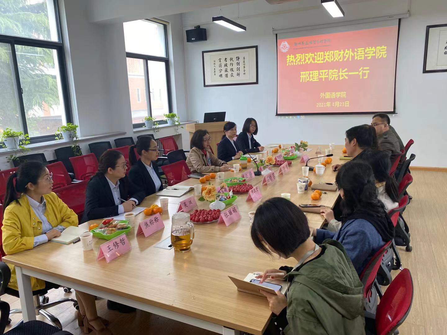 2021年4月23日上午9点,郑州财经学院外语学院邢理平院长一行莅临我校全球十大网赌正规官网,在教学1号楼206会议室就高校教学质量评估等问题展开讨论交流。