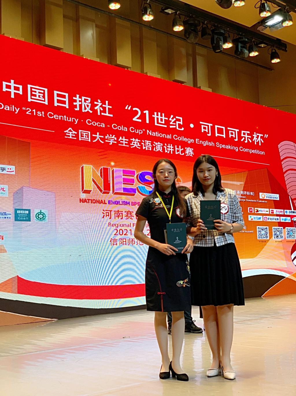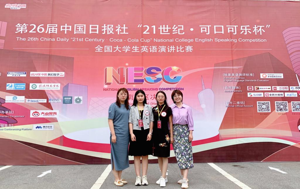 5月22日,我院外国语系商务英语专业18级王雨欣,19级杜嘉琪在教研室老师白光、唐瑜佳两位老师带领下,赴信阳师范学院参加由中国日报社主办的第26届“21世纪可口可乐杯”全国大学生英语演讲比赛河南赛区决赛。