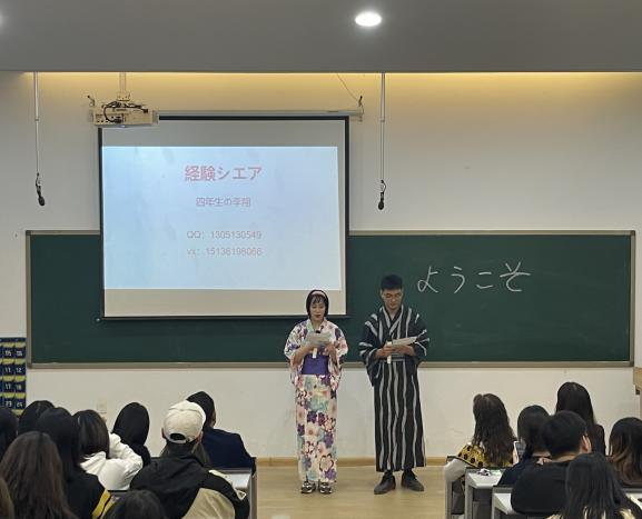 节目表演结束,主持人李翔代表在校生给大家分享了自己的日语学习经验,提醒刚刚步入大学的学弟学妹一定要注意健康与学业的平衡。之后,新生代表李洋同学与王颖同学进行了发言,分享了自己对大学生活的期待与憧憬。王颖同学向同学们发出呼吁:“明るい未来のために、一緒に頑張りましょう!”。