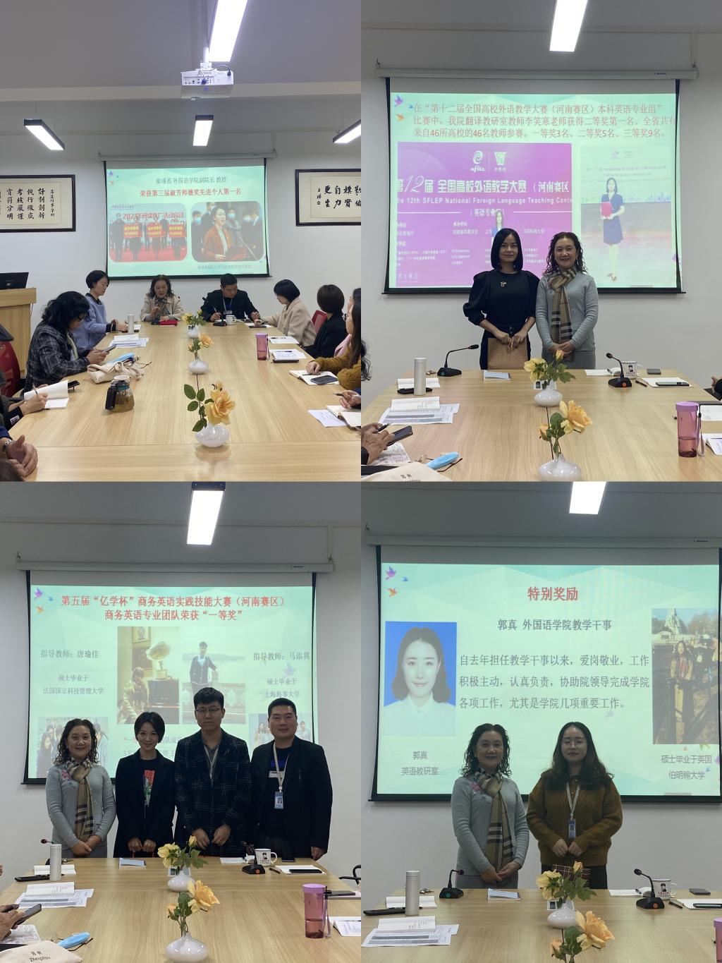 首先,张梦院长对三位老师进行嘉奖,她们分别是获得“淑芳师德奖”的崔瑾英老师,全国高校外语教学大赛二等奖的李笑寒老师,以及第五届亿学杯商务英语实践技能大赛一等奖团队唐瑜佳、马添翼老师团队。张院长对相关老师与团队的成绩表示热烈祝贺,并颁发证书,进行嘉奖。紧接着,张院长对教学干事认真负责的郭真老师进行了表扬。张院长以此为契机鼓励其他老师努力进取,再创辉煌。