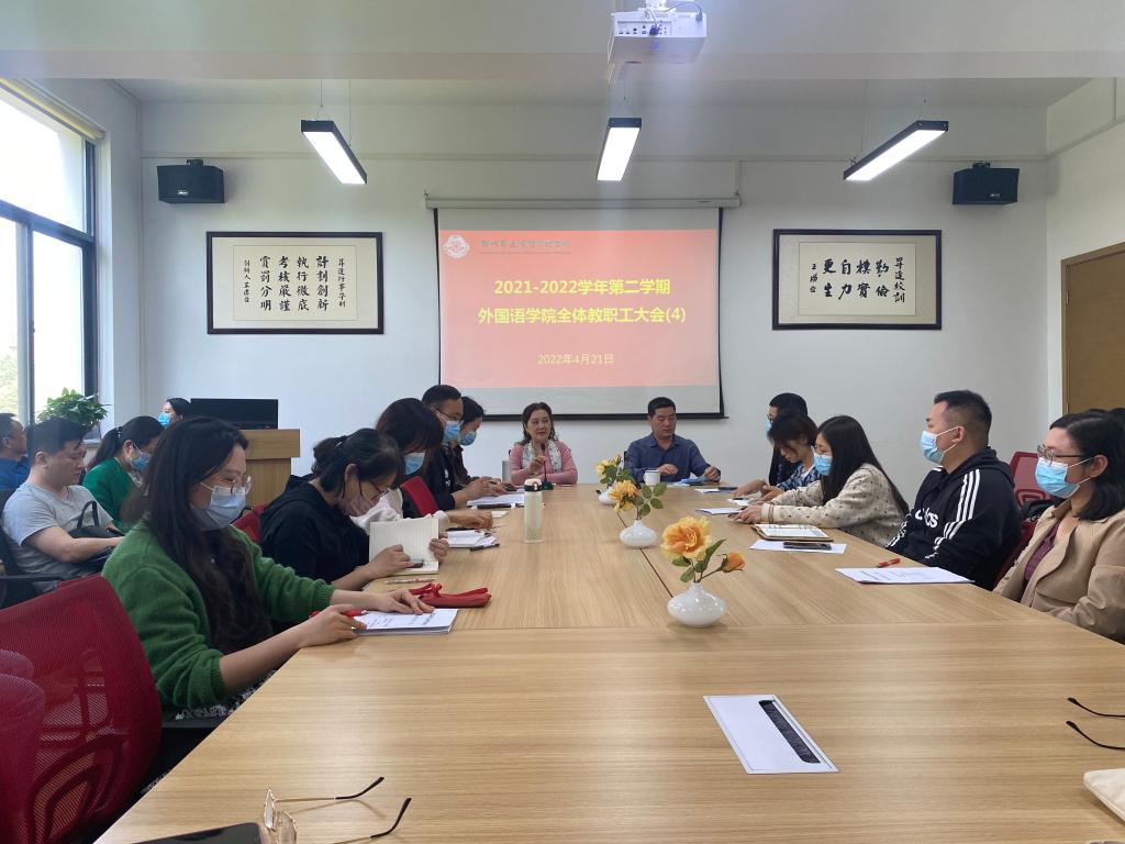 2022年4月21日下午三点,全球十大网赌正规官网2021—2022学年第二学期第四次全体教职工大会于外语学院会议室召开。