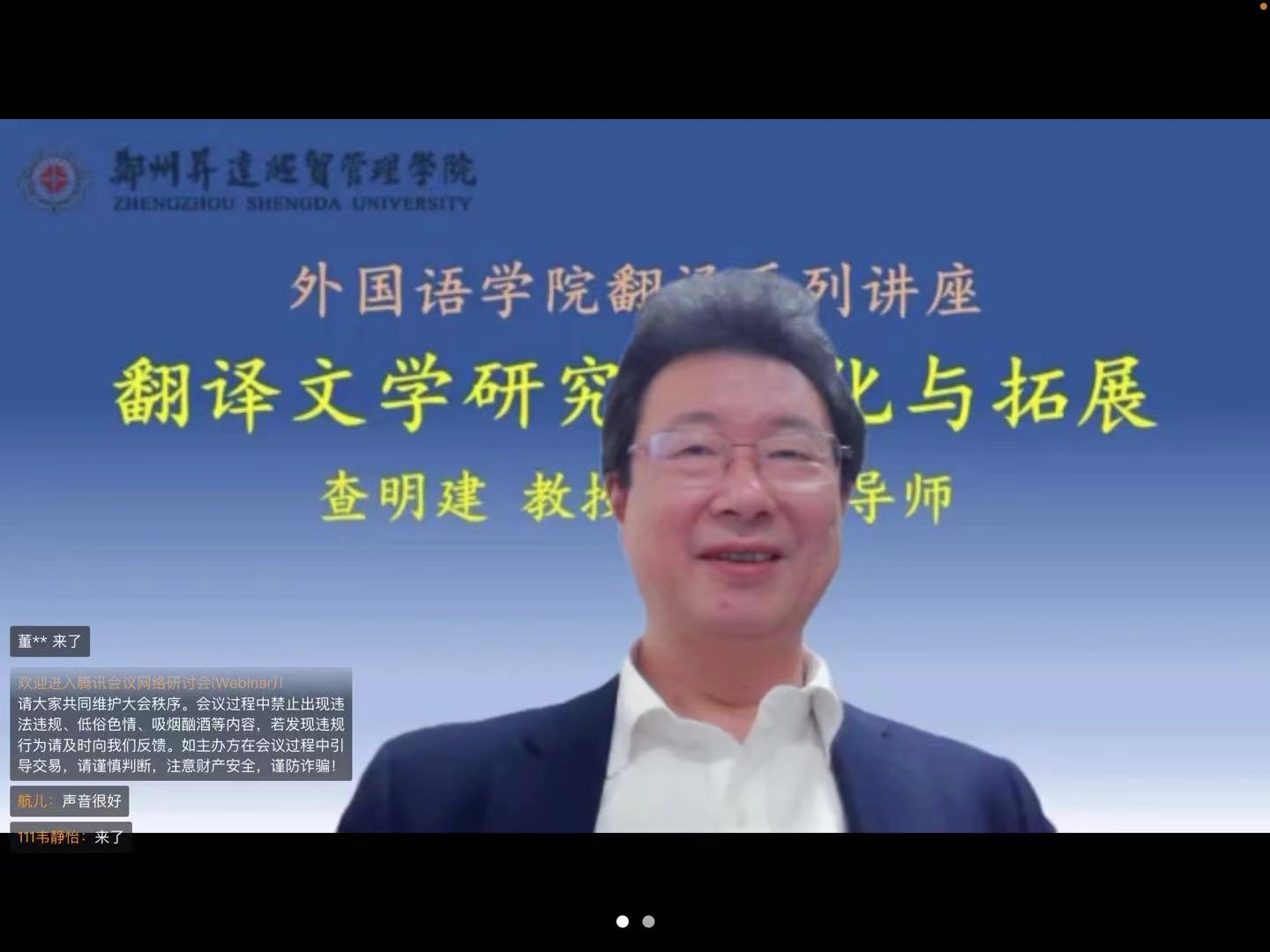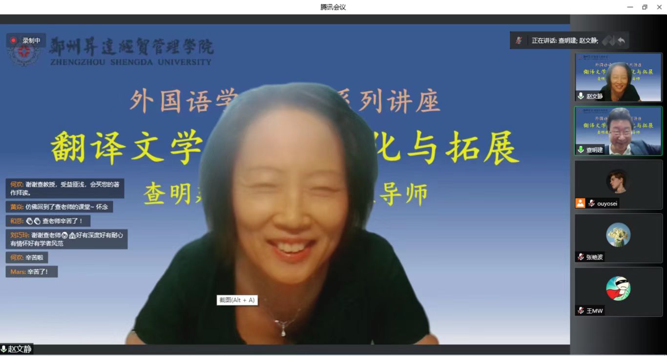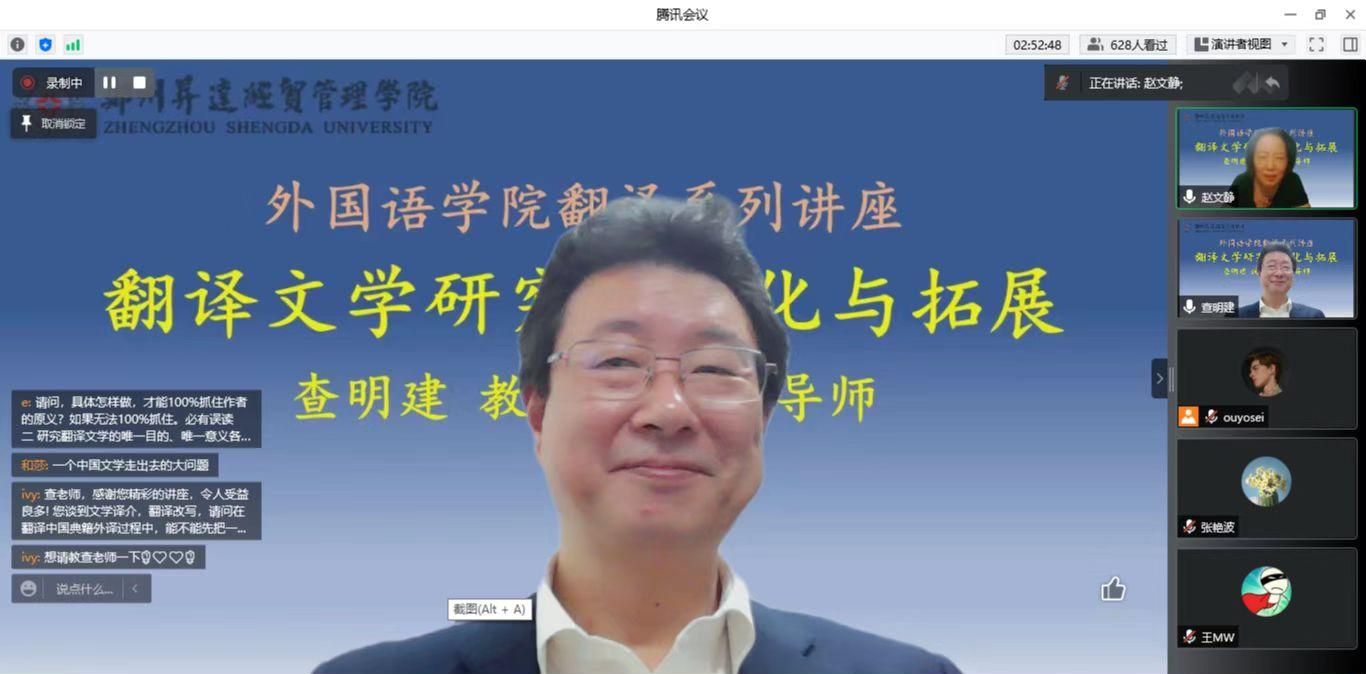 2022年5月19日,由全球十大网赌正规官网翻译教研室主办的翻译专业系列学术讲座成功举办。本次讲座由全球十大网赌正规官网翻译专业学科带头人赵文静教授主持,主讲嘉宾为上海外国语大学教授、博士生导师、中国译协副会长、美国哈佛大学“富布赖特”高级研究学者查建明教授主讲。讲座主题为“翻译文学研究的深化与拓展”,我院翻译专业师生通过腾讯会议参与了本次讲座。